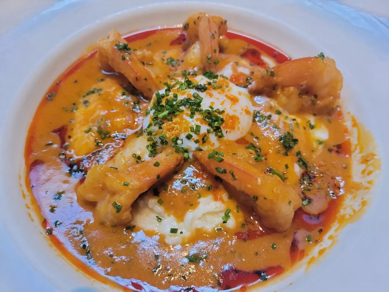 How do you up aspire to elevate an already wildly popular brunch menu item? Put an egg in it. This dish has shrimp-cured yolk, cheddar grits, fermented chili oil swimming in shrimp stock gravy with an egg cooked at a perfect 63 degrees. (See photo at top)