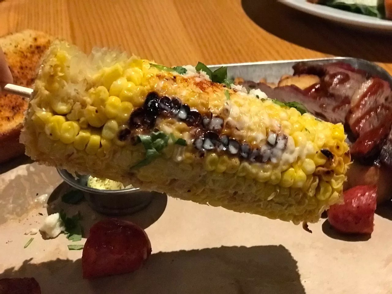 Aside from the ribs (which earn a $2 up-charge when added to your combo), the meat choices were a bone-in chicken breast (umm, okay), jalapeño-cheddar sausage (say what?), smoked brisket (am I still at Chili’s?) and chicken crispers (oh, right, I’m still at Chili’s). All combos come with roasted street corn, fries, chile-garlic toast and garlic dill pickles, so picking meats is the only decision you need make. We ordered a two-meat combo with the most barbecue-sounding meats: brisket and sausage.