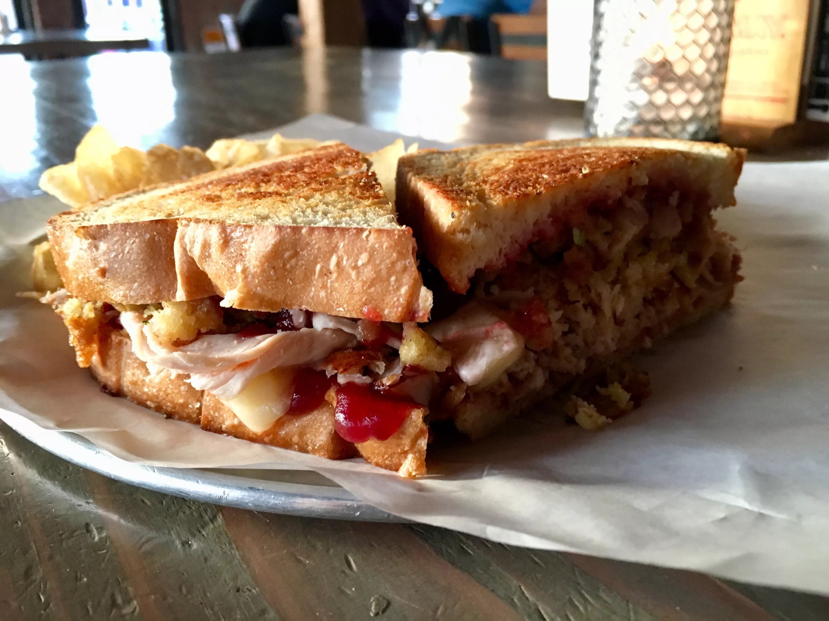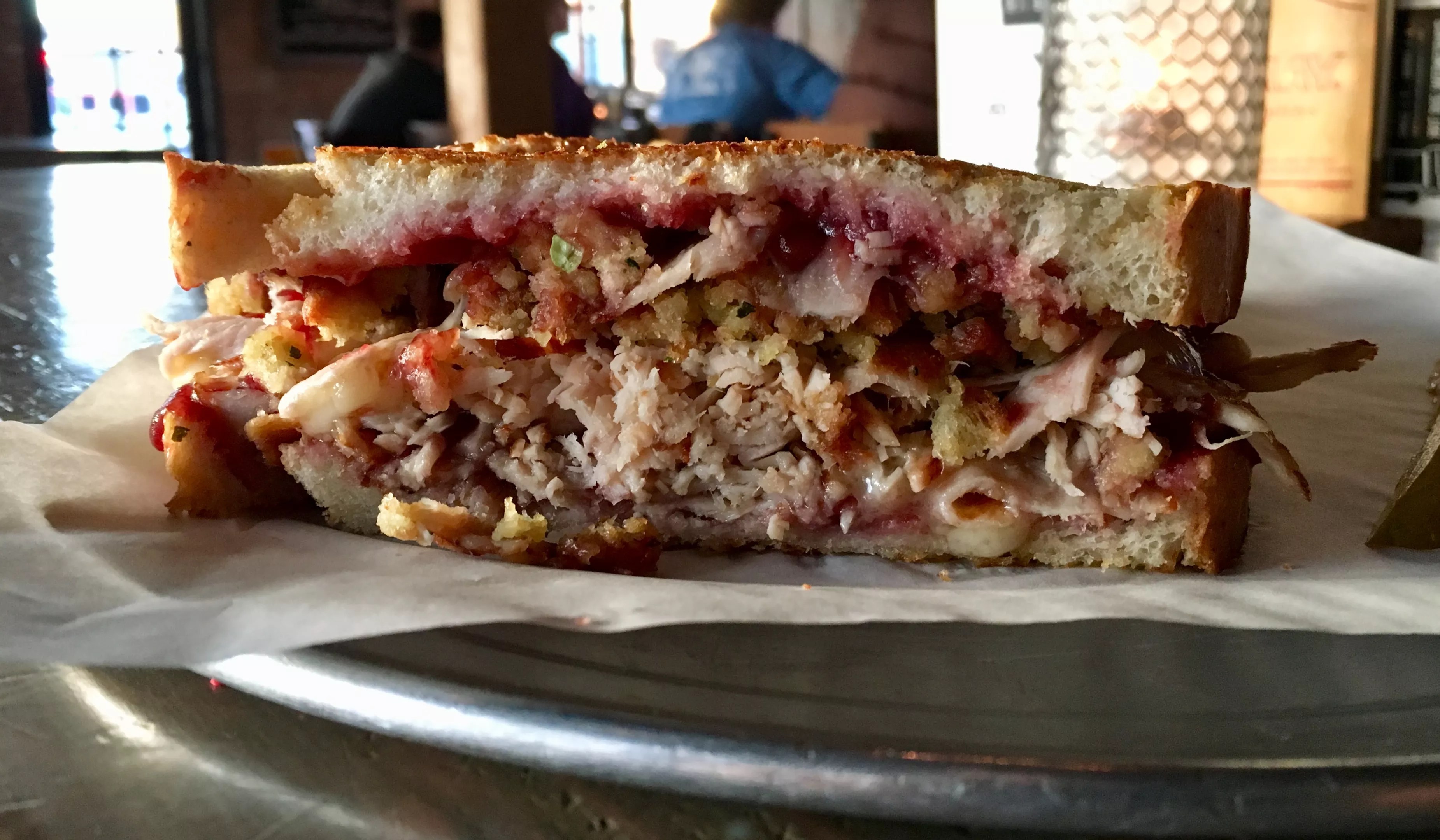 Two nights before Thanksgiving, there are Creamsicle-tinted clouds streaking high above the Cold Beer Co. patio in Deep Ellum. The air is the temperature of a Texas autumn, which means it feels like May anywhere else, and inside the bar, the heat’s pumping to the music. The room is sparsely populated, a few people dotting the stools, which gives the neighborhood watering hole that Goldilocks effect that’s always comforting – not too many people and not too few. There’s also plenty of beer, a perfect complement to Cold Beer’s November special: a loaded, big-as-a-Harvest-moon Thanksgiving leftovers sandwich.
