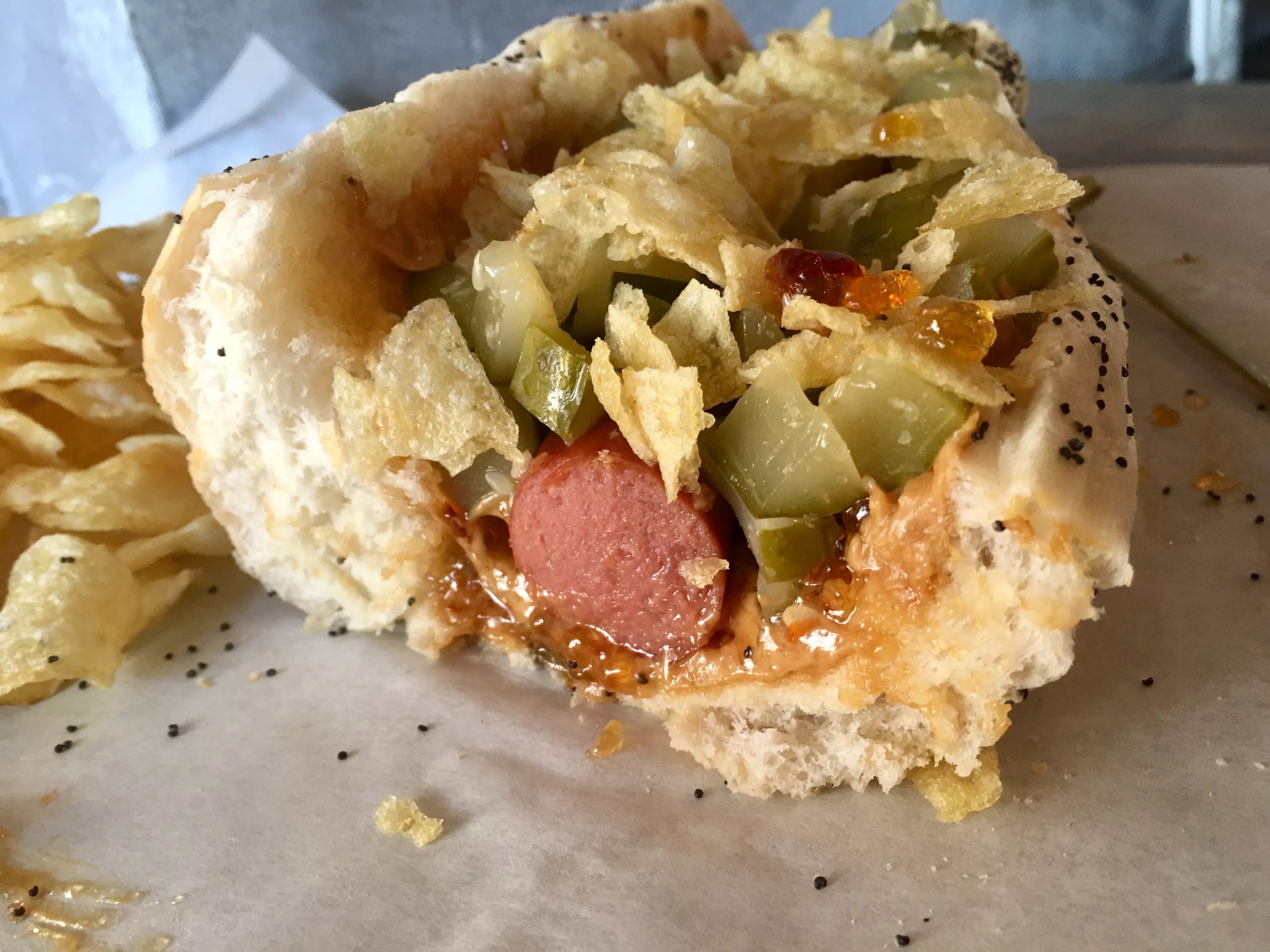 The kitchen at Cold Beer Company is small. It’s the size of a studio apartment on a mime’s salary, and it’s hoarded-up with enough equipment to fire-up dishes like a meatball sub with melted Provolone cheese, delicious Wagyu cheeseburgers on Tuesdays – they blend bacon, cayenne pepper, garlic, salt and egg right into the beef – and a smoked turkey sandwich that’s as big as a Star Destroyer. They don’t have much room, but they find room. They have found room for a new, bizarrely delicious creation: A footlong hot dog in a poppy-seed bun, littered with spicy pickles and pulverized potato chips, and – help us all – peanut butter.
