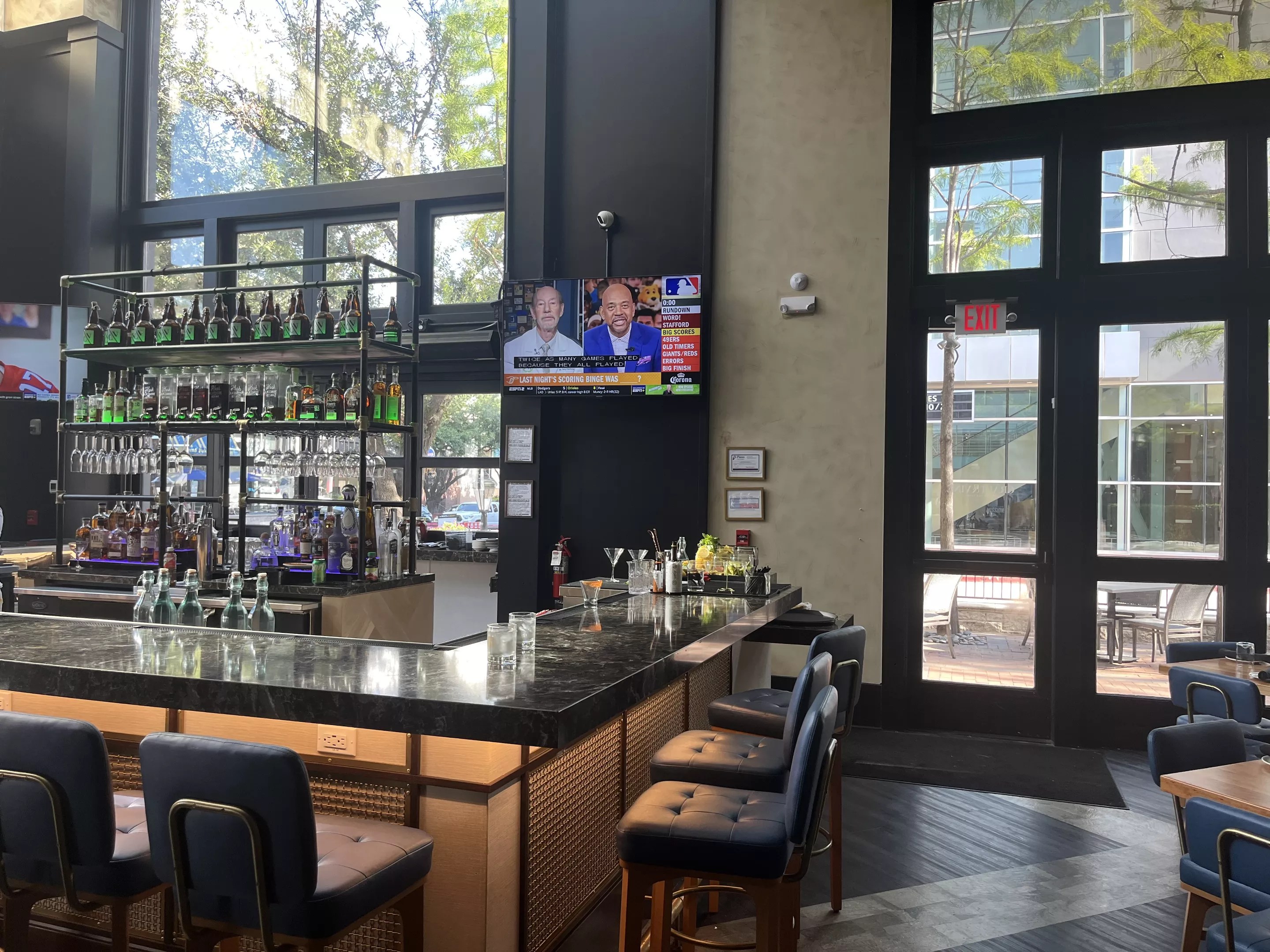 The full-service bar is tucked into the corner of the restaurant, and a second-floor balcony dotted with extra seating overlooks it. High ceilings, geometric art and sprawling wall vines pay homage to the restaurant’s name.