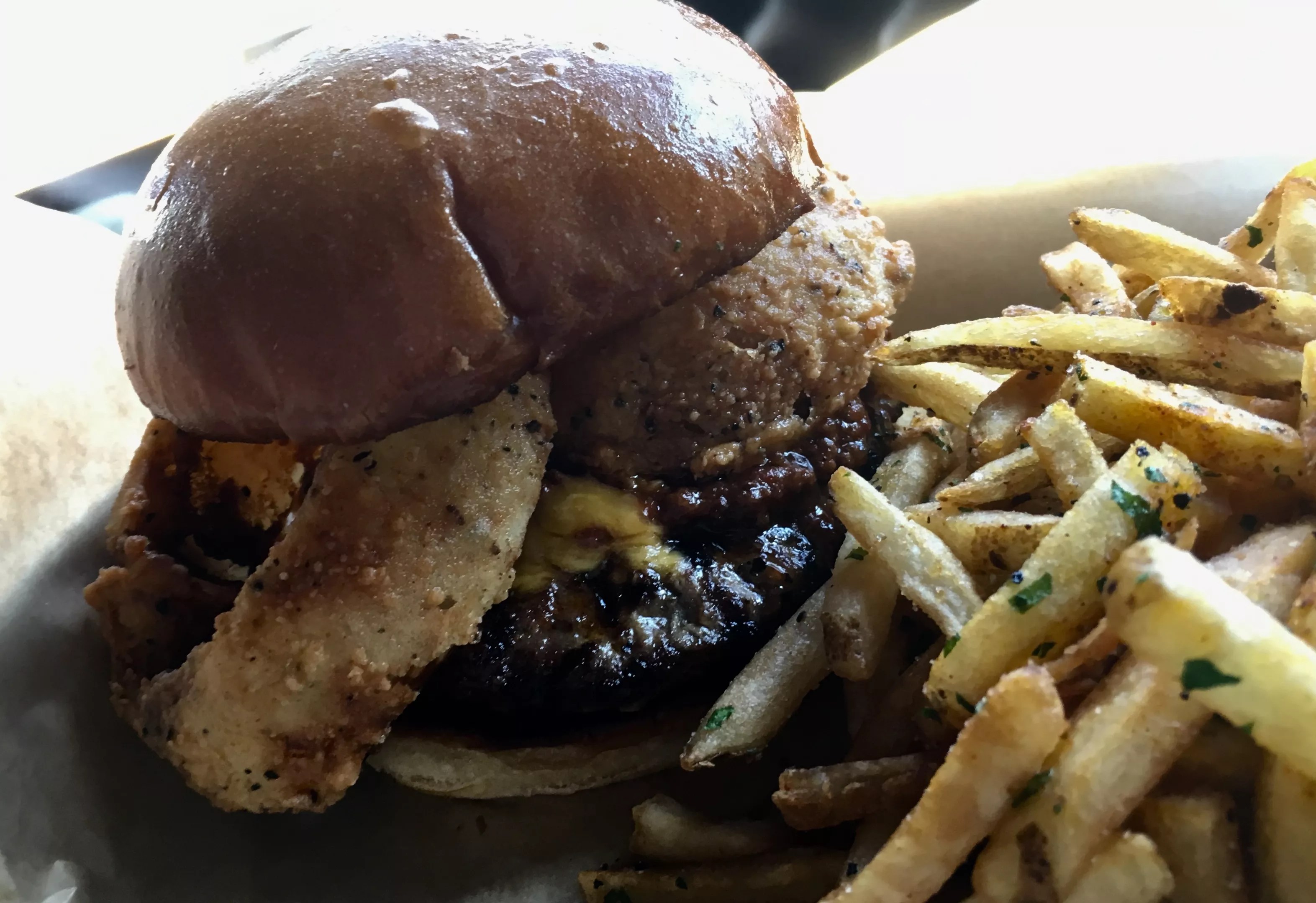 On a recent visit, the sun’s rays shoot into the bar with strength. The Smokestack is the only burger on the menu, hiding under the usual barbecue sandwiches, and it comes with a side for $14. French fries are great, seasoned and far better with hammers of the mustard vinaigrette that hangs out on the table. (You’ll want this for the burger, too. Trust me). The burger has crisp char marks from the grill and tastes of smoky fire. Chili is restrained – it’s more brushed over the patty than slopped on. The onion rings look crunchy down under the challah bun, a soft thing that keeps every ingredient inside the sandwich. I finished the first half, buttery beef juices mixing with the smoky tomato of the chili, in a few big, satisfying bites.