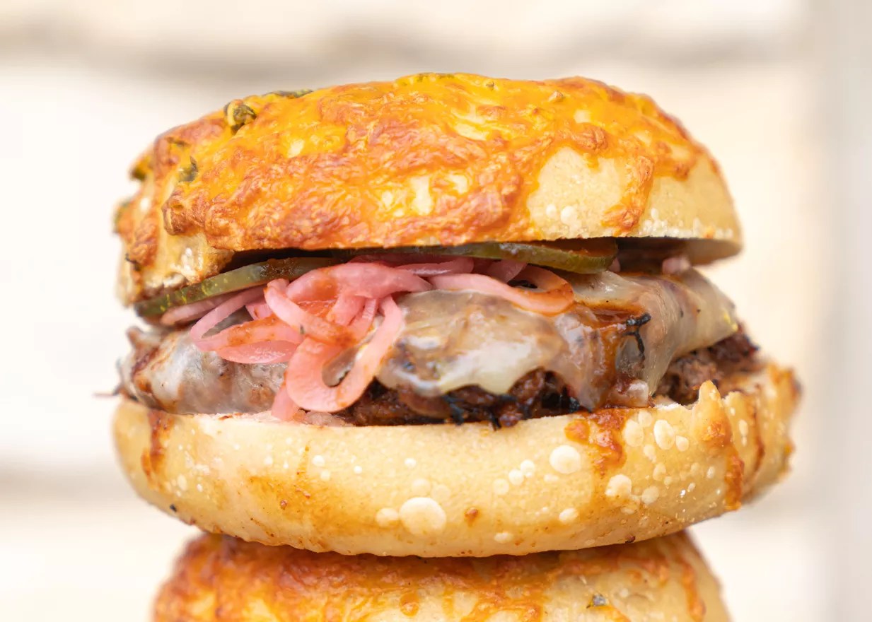 Framed by a jalapeño cheddar bagel, the Texas Twist is packed with the brisket, pepper Jack cheese, pickled onions and Boar’s Head dill pickles.