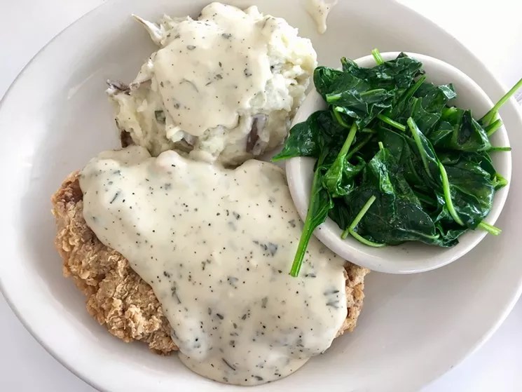 For less than 11 bucks, you’ll get Lucky’s chicken-fried steak, spinach from Oak Hill Farms in Poteet, Texas, and delicious mashed potatoes with red-eye gravy.