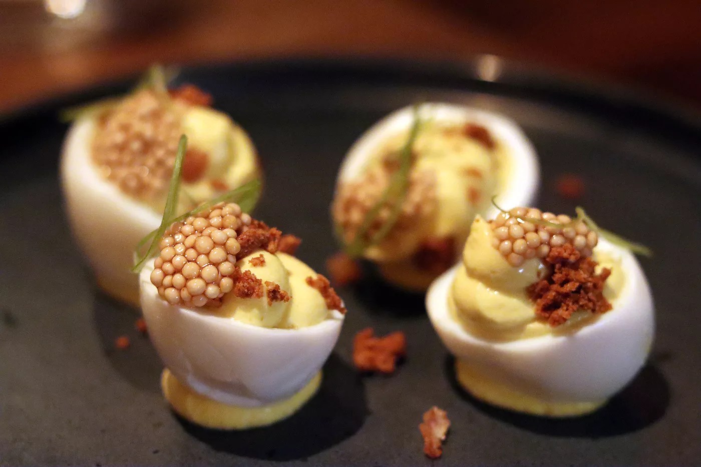 The Bahamian deviled eggs ($5 during happy hour, $8 otherwise) are an experience. Maybe it’s the truffle oil that shines through the hot mustard, or it could be the chive, shallot and crispy onions, but our money is on the rye mustard seeds and a brown-butter crumble that makes this otherwise simple appetizer pause-worthy.