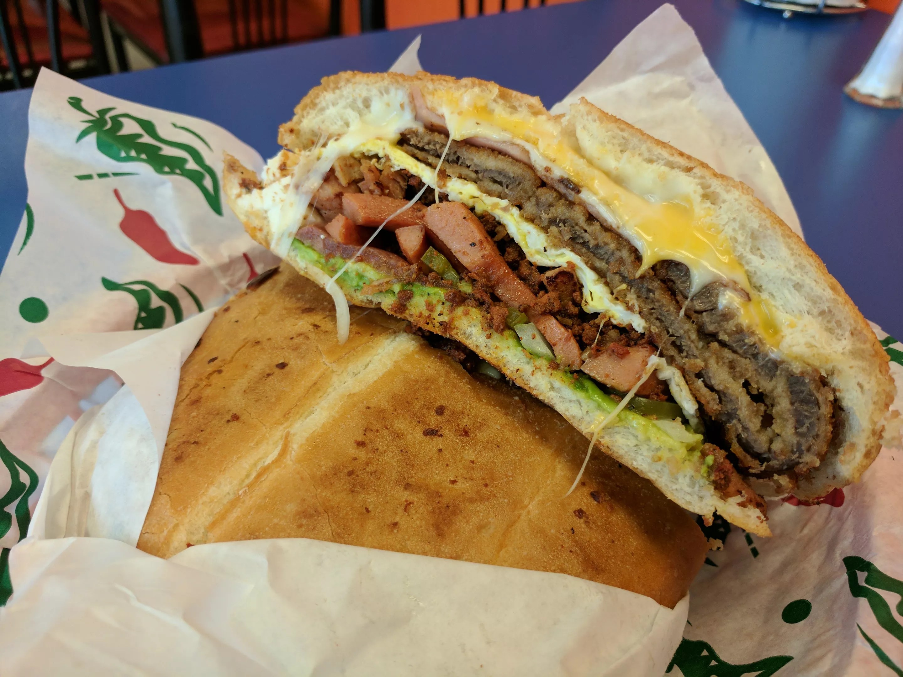 By my count, that’s breaded milanesa cutlet, slices of deli ham, chorizo, sliced-up hot dogs, chunks of pork, smoked poultry of some kind, a couple of fried eggs, both unmeltable and fully melted varieties of cheese, avocado, tomato, onion and slices of jalapeño pepper, all on a sandwich the size of my laptop’s keyboard.