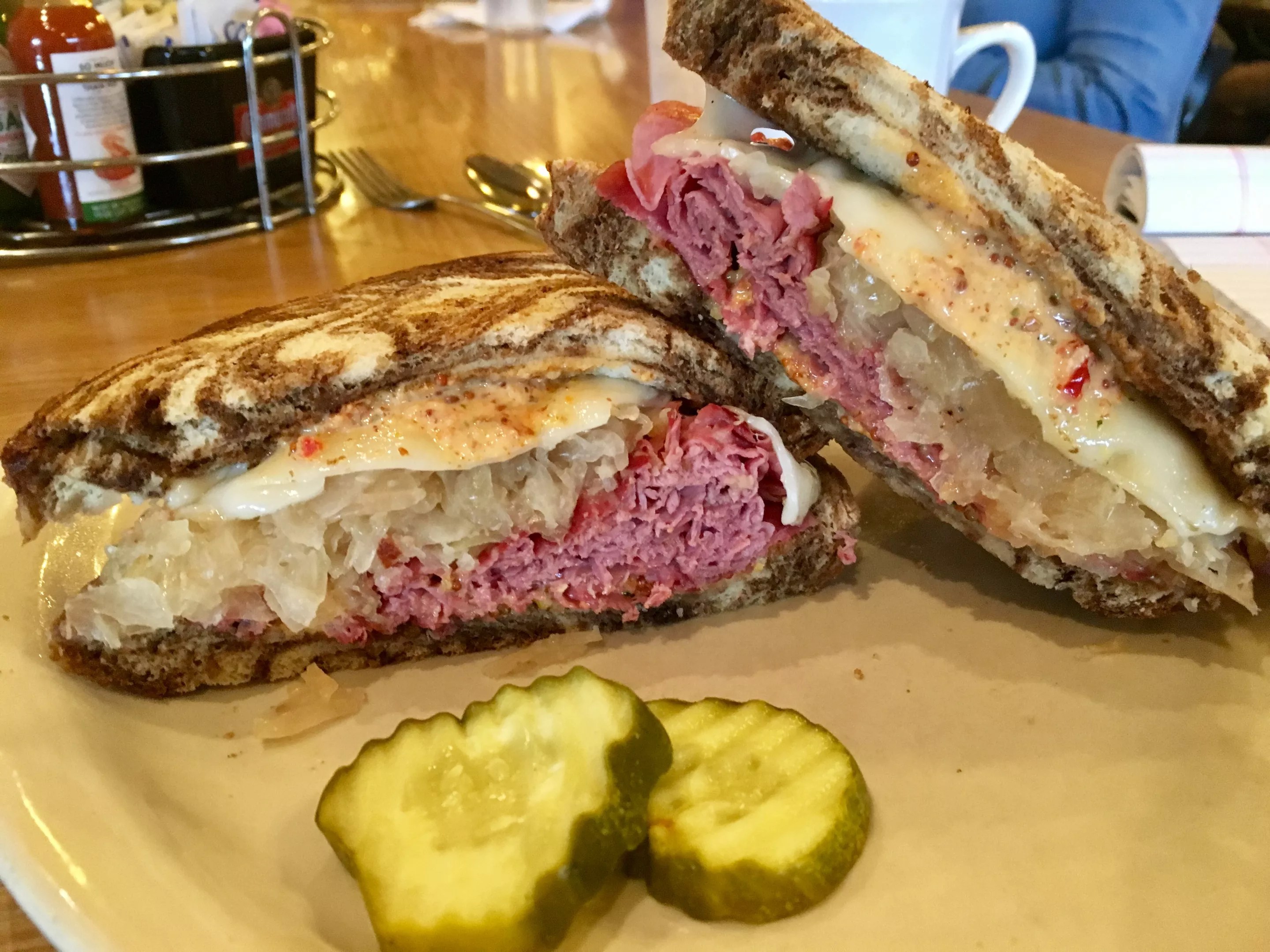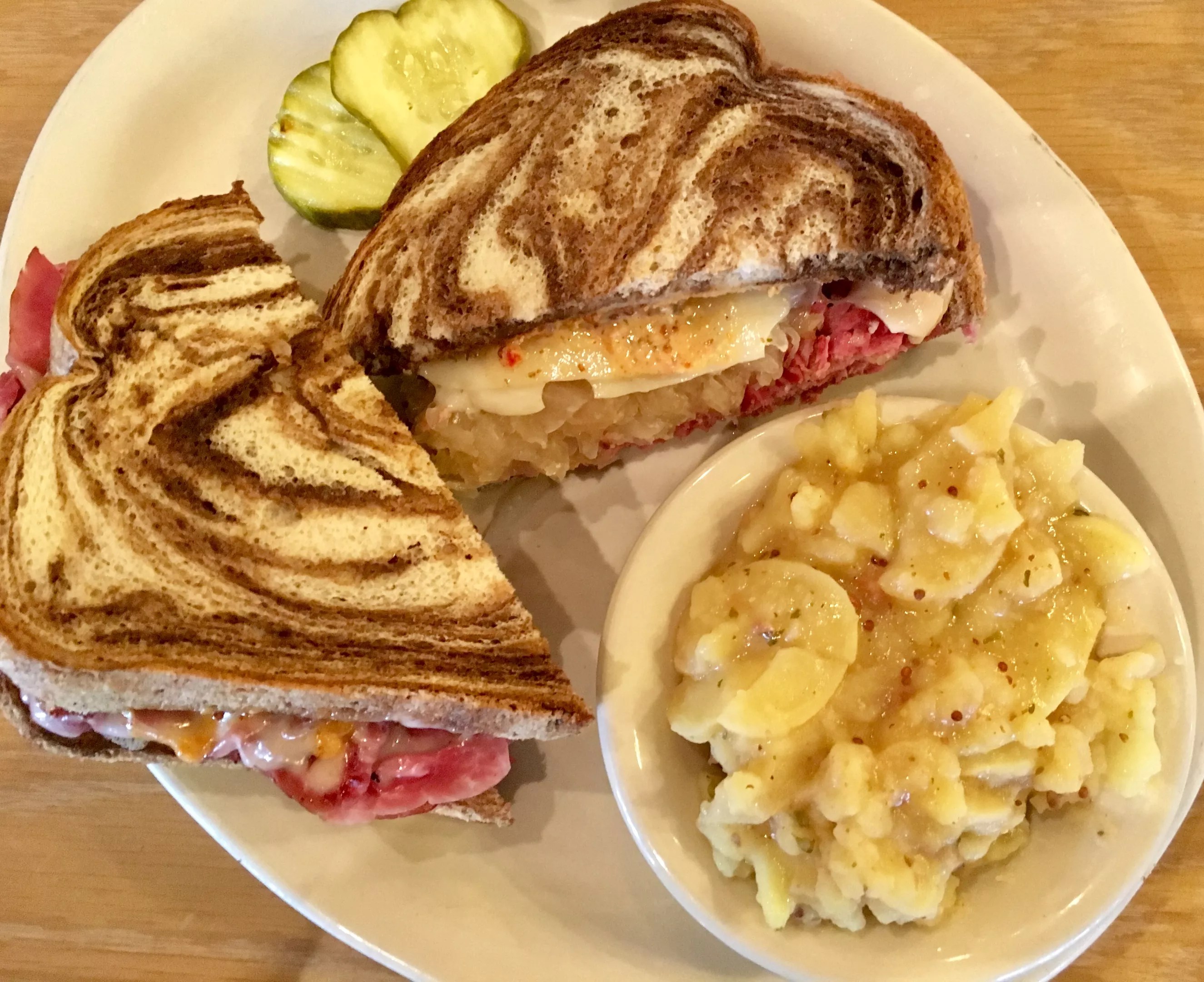 I’m sitting at the counter with a cup of coffee in a nondescript porcelain cup and making squiggly lines of brown mustard over the sandwich. Swiss melts into the Russian dressing, which has crackles and pops of acid from mustard seeds. Order the potato salad instead of fries; it’s potato coins cooked down with bacon, wine and caraway seed. All together, with that homey sauerkraut, it feels like prep for a chilly winter, one of those serene ones when you can grab a hot, fresh Reuben and slip into hibernation.