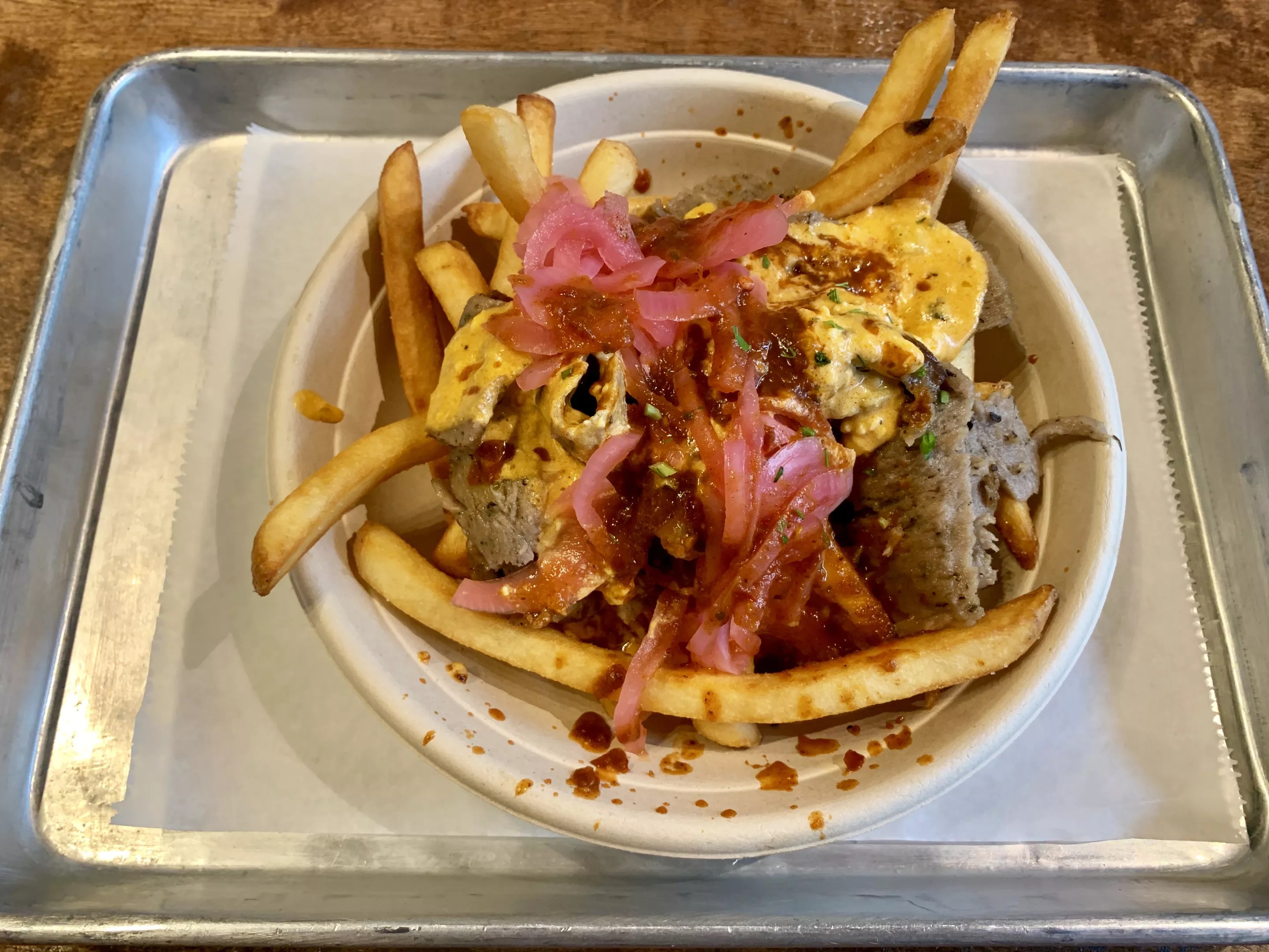 In addition to the gyro fries ($7.99), other starters include chickpea falafel ($4.99), spanakopita ($4.99), lemon chicken soup ($2.99 for a cup, $3.49 for a bowl) and a mezze platter ($9.99) with hummus, Kalamata olives, feta, cucumber tomato salad, tzatziki, pickled red cabbage and warm pita wedges.
