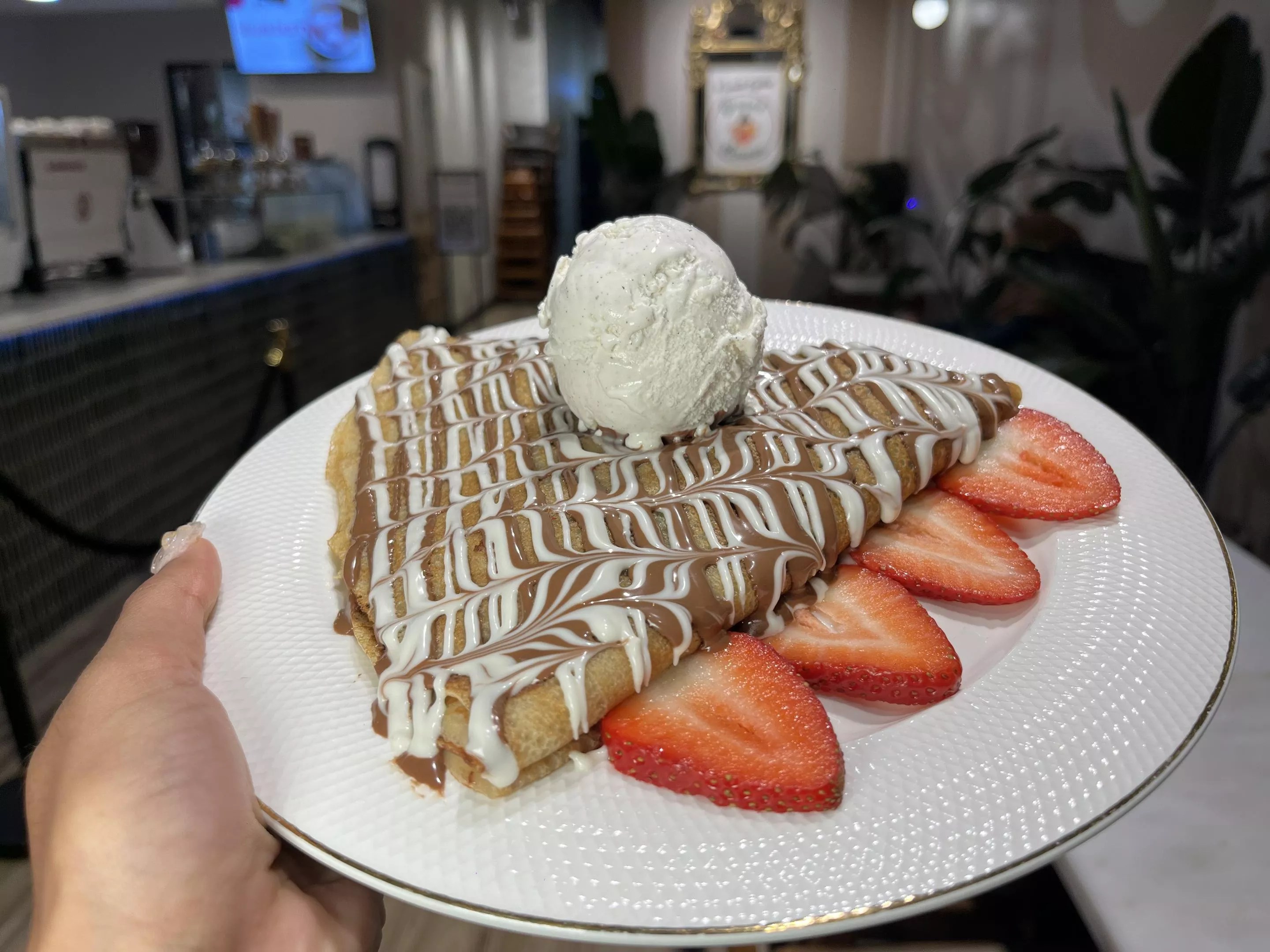 Crepes are the shop’s specialty, patterned with two types of chocolate fondue.