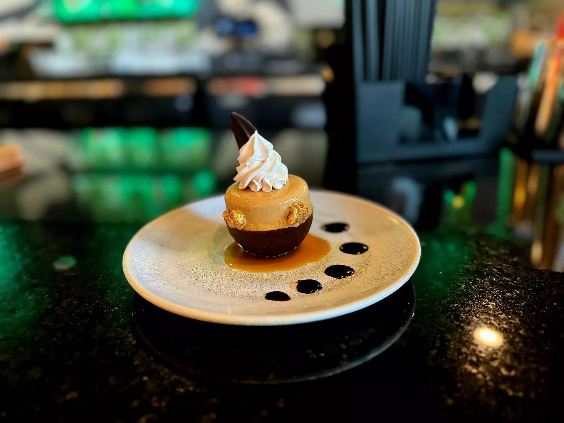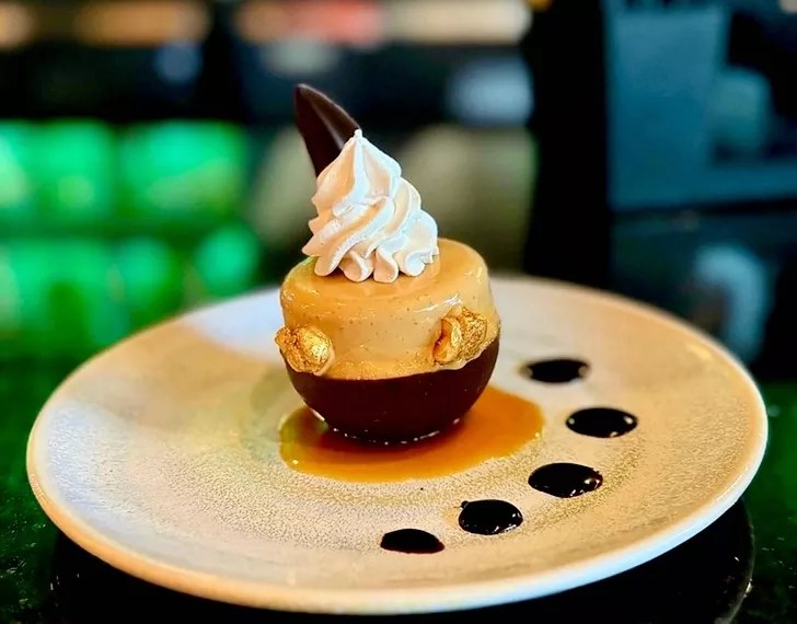 So, the reason we came: Pascal Sanchez’s “Something Chocolate” dessert for a mere $16. We’d describe this chocolate lover’s dream creation as peak decadence. A half-chocolate sphere glazed with hazelnut and mouse, feuilletine (a crispy wafer of baked sweetened crêpes crumbled into flakes), chocolate ganache, a meringue insert all topped with bourbon vanilla Chantilly. There’s certainly a lot to unpack here.