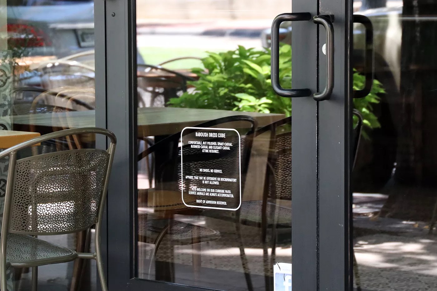 The Mediterranean restaurant’s dress code is “comfortable, but polished,” requiring smart-, business- and elegant-casual attire. No shoes, no service. A sign is posted on the glass door, in white lettering, about knee height, a couple of feet off the ground.