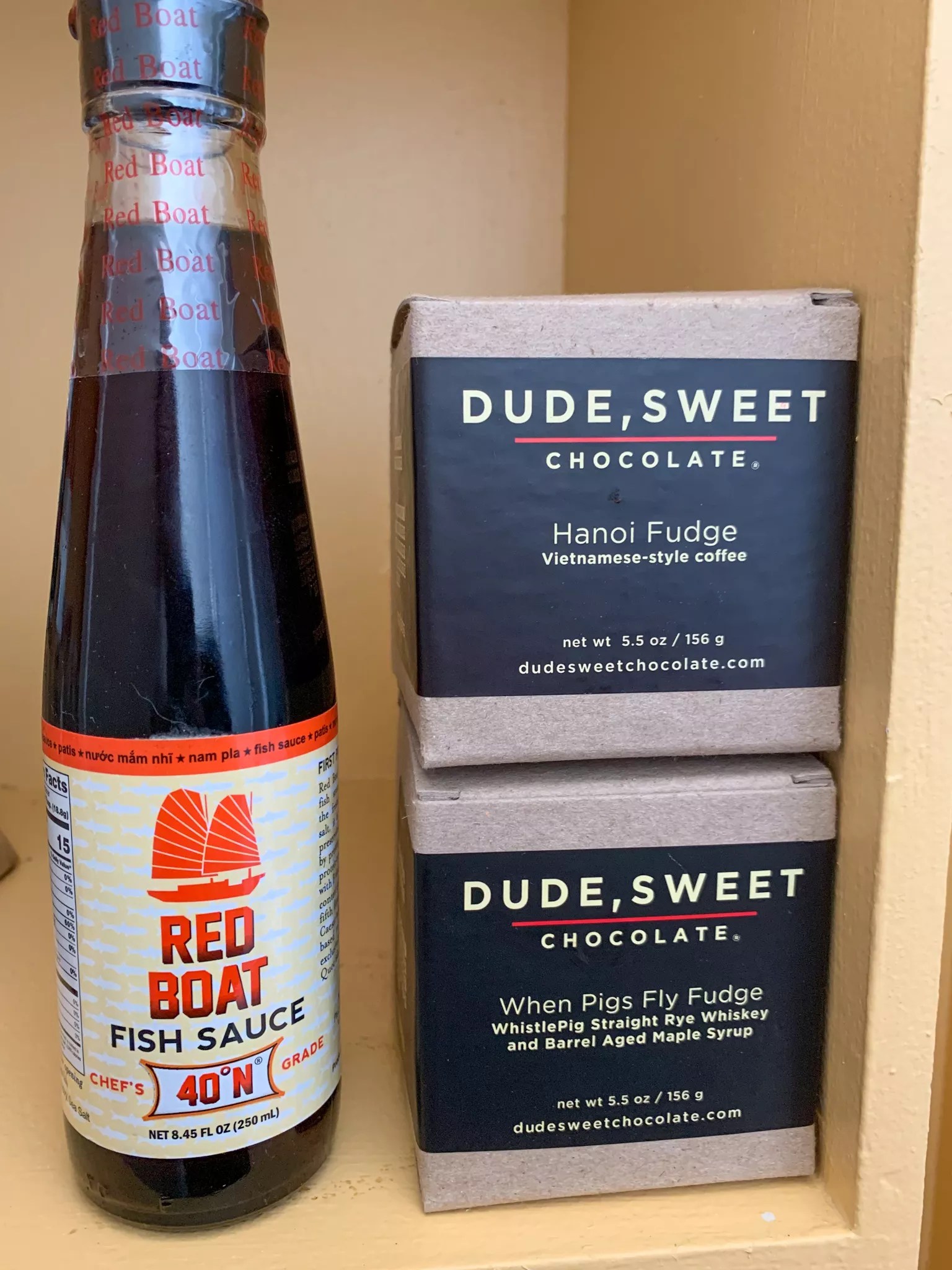 When I moved into my apartment last week, I had few pantry items: Gummy bears, popcorn kernels, fish sauce and two boxes of Dude, Sweet fudge truffles (those were Hanoi and When Pigs Fly, by the way).