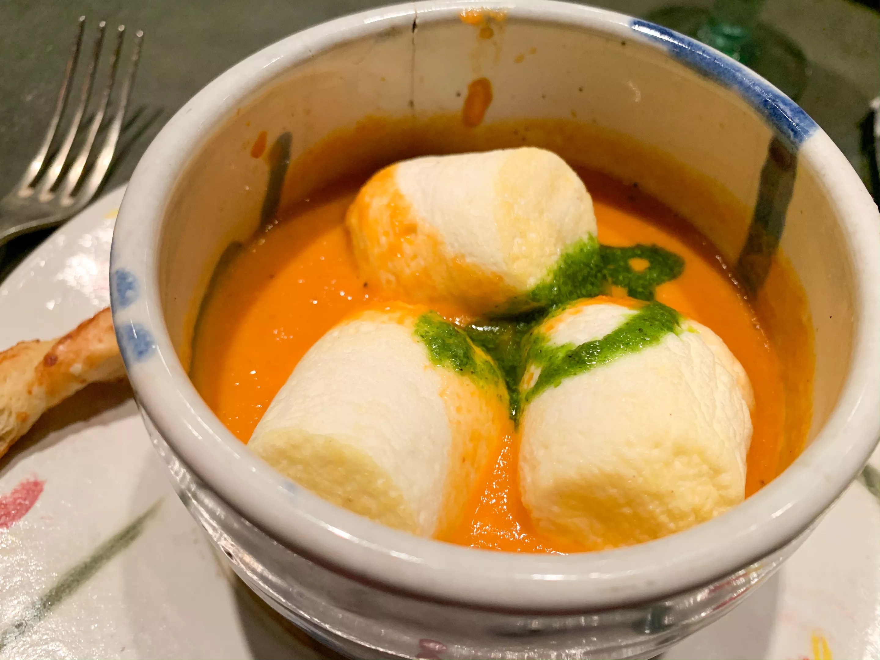 I like the people-who-eat places, and it’s coincidentally one of those, too. Start with the marshmallow soup – a better version of a tomato-basil soup. A tomato soup with just enough drizzle of pesto (we’d welcome more) is the base of three large marshmallows – they look and feel of the s’mores ingredient, but they’re better because they’re really goat cheese.