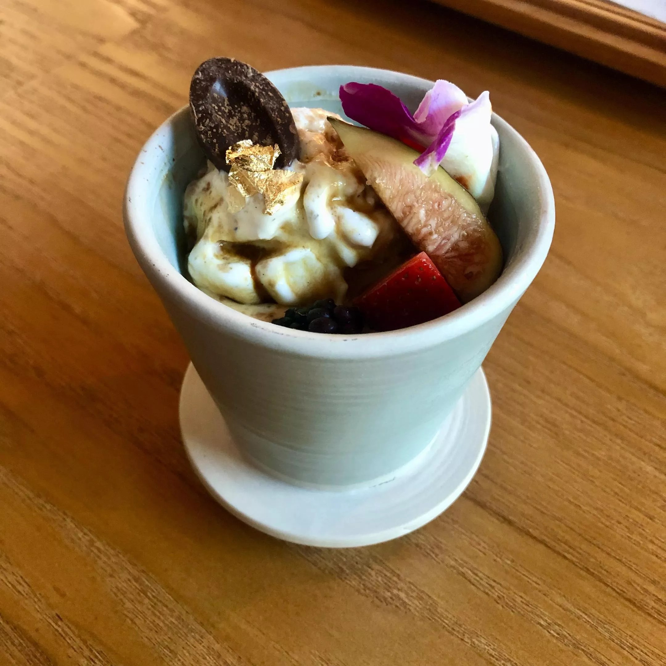 The $9 affogato was art. A strong shot of espresso plays well with the sweetness of the ice cream, which is topped with blackberries, figs and plums, along with a little piece of chocolate. And, of course, that bit of gold leaf and an orchid (we just can’t get over).