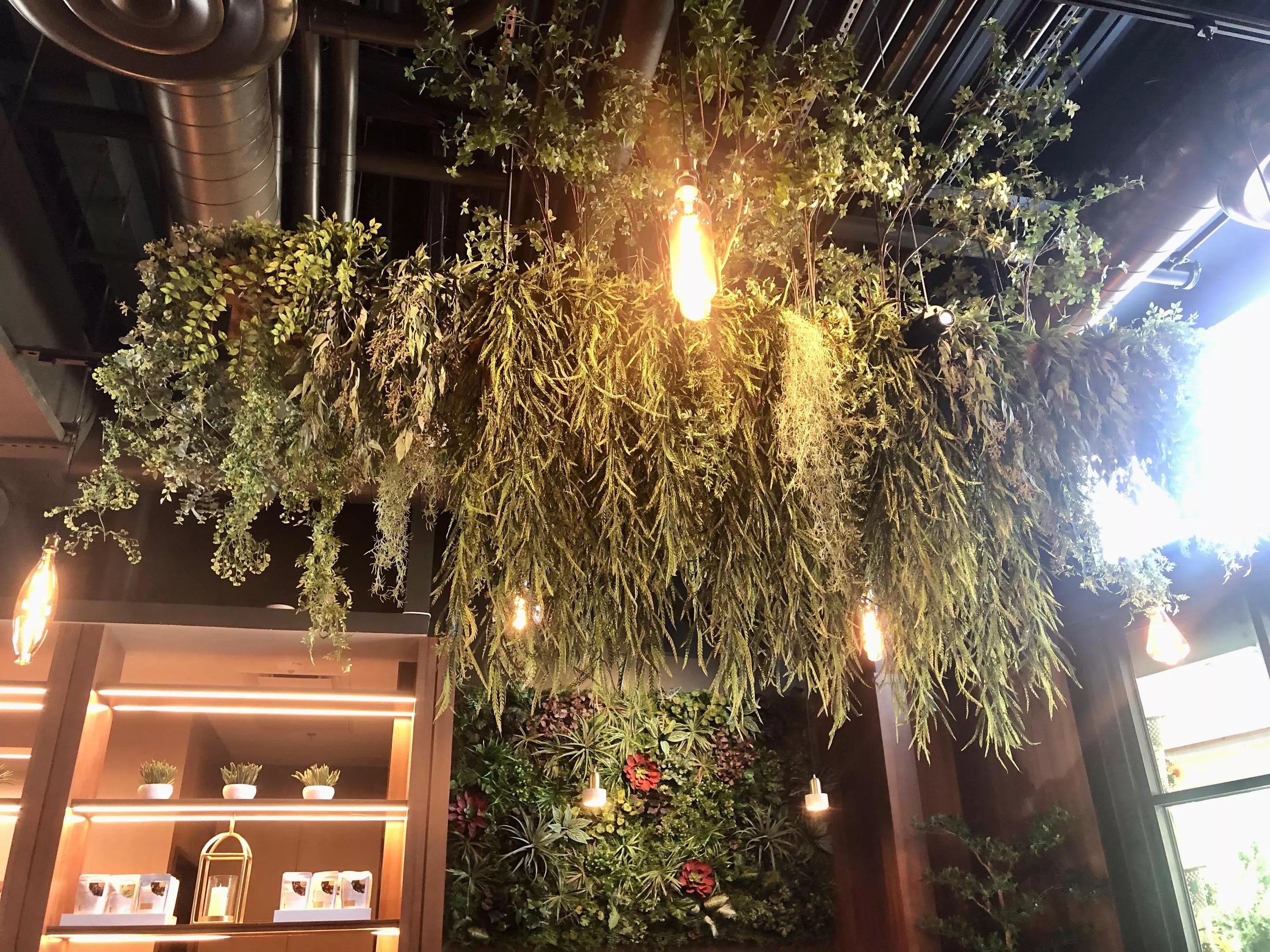 The flowers and greenery lining the walls and hanging from the ceiling give rainforest vibes.