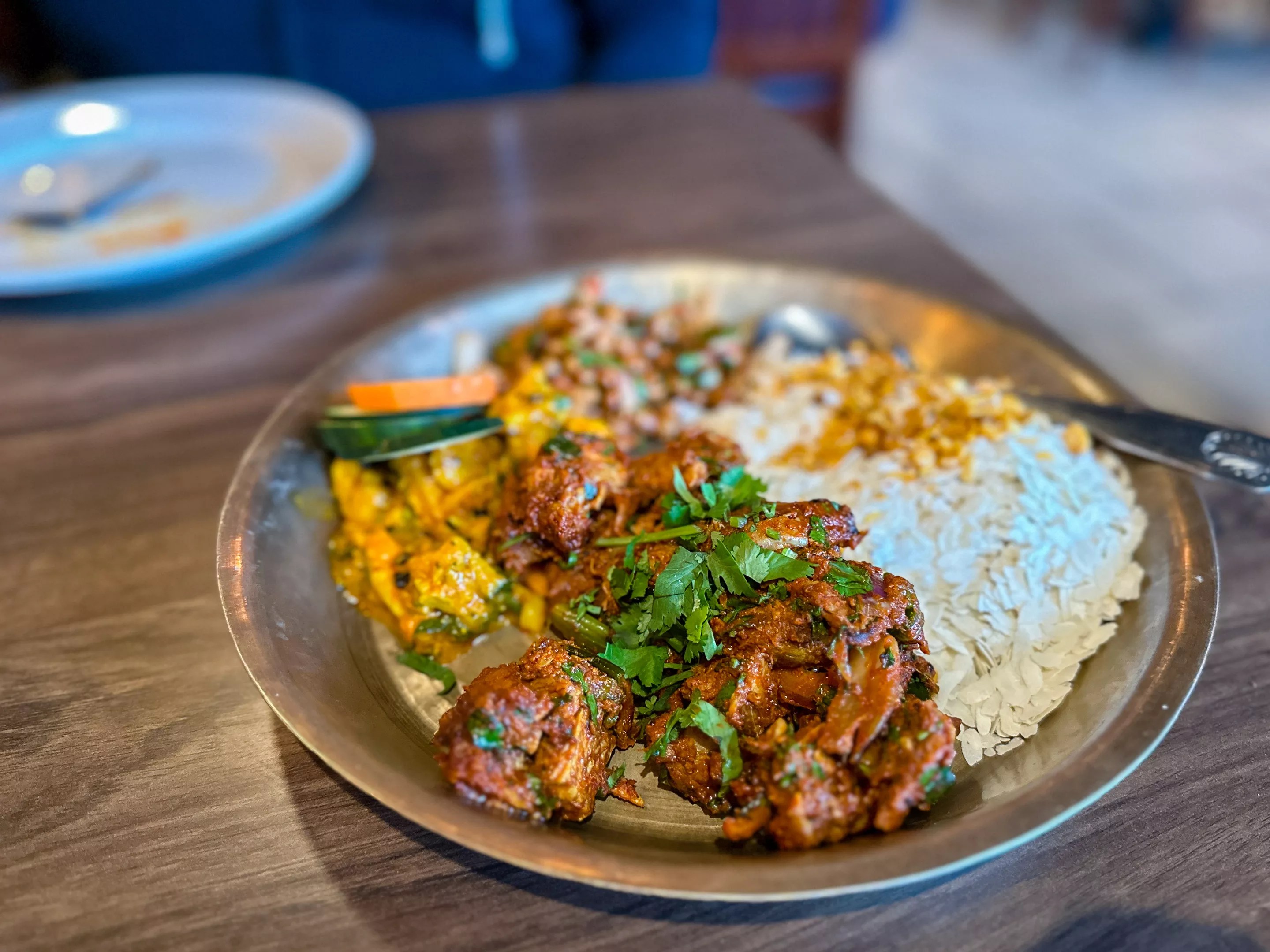 We started with some bullet naan and mixed vegetable pakoras. The naan, stuffed with hot green chilies and bits of potato, was hot in both Scoville units and temperature and perfectly cooked with a slightly charred edge. The pakoras were described in the menu as as gobi, potato, onion and jalapeño stuffed with basin pepper and deep fried, but they arrived on our plate in a deconstructed state with some chutney for dipping. Not what we were expecting, but it was serviceable nonetheless.