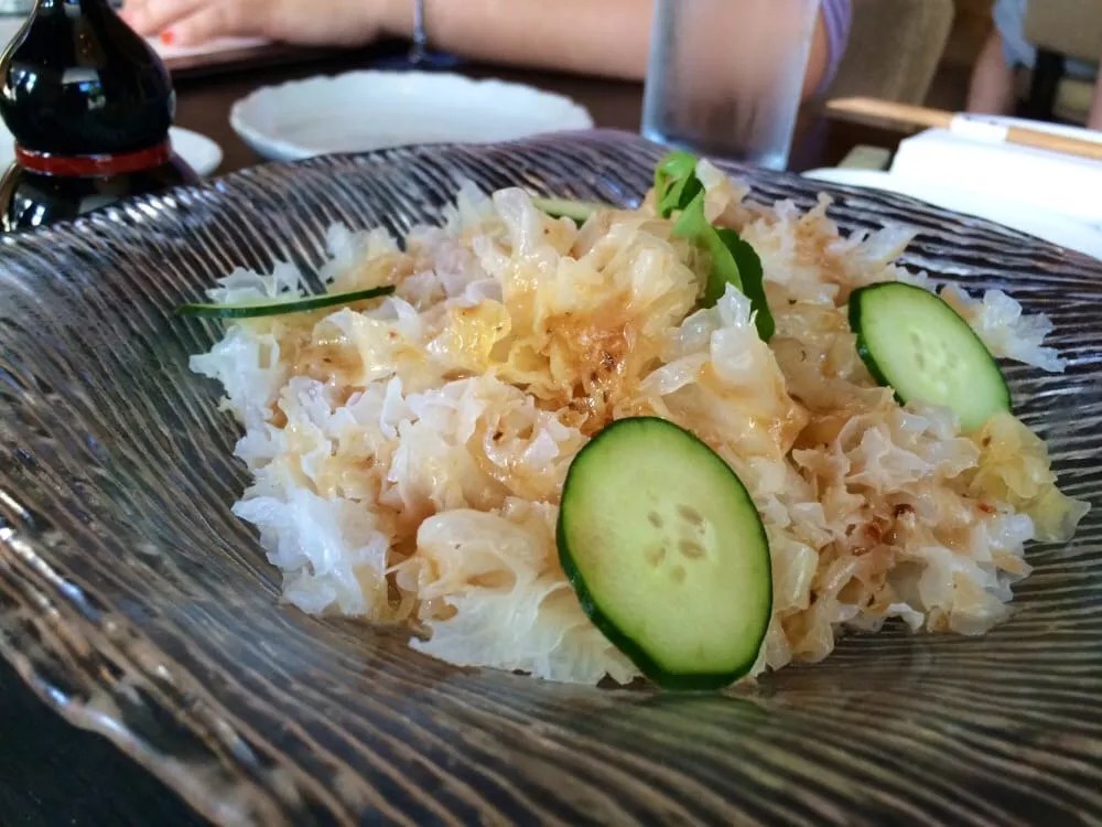 Speaking of Spanish tapas, another must-have unique eat is the fried blood rice sausage (morcilla de arroz frita) at Si Tapas. Morcilla originated in Spain and is the first sausage to be made with a recently slaughtered pig. It consists of fat, pork blood, onions and rice in a casing. When it is cooked and fried in olive oil, it becomes the perfect bite of spiced sausage with a mild tang and a crumbly texture. White seaweed salad at Tei-An Angie Quebedeaux