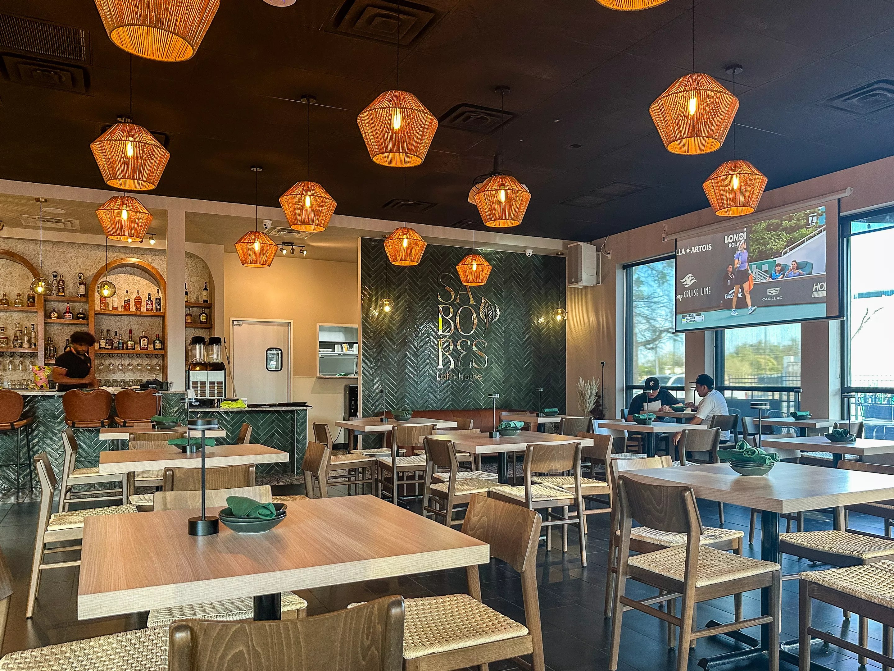 The interior is bright and cozy, with rattan lanterns dangling from the ceiling and a meticulously staged bar that would make a Hollywood set designer proud. A well-designed stylized logo further draws the eye along the back wall, adding a bit of relaxed elegance.