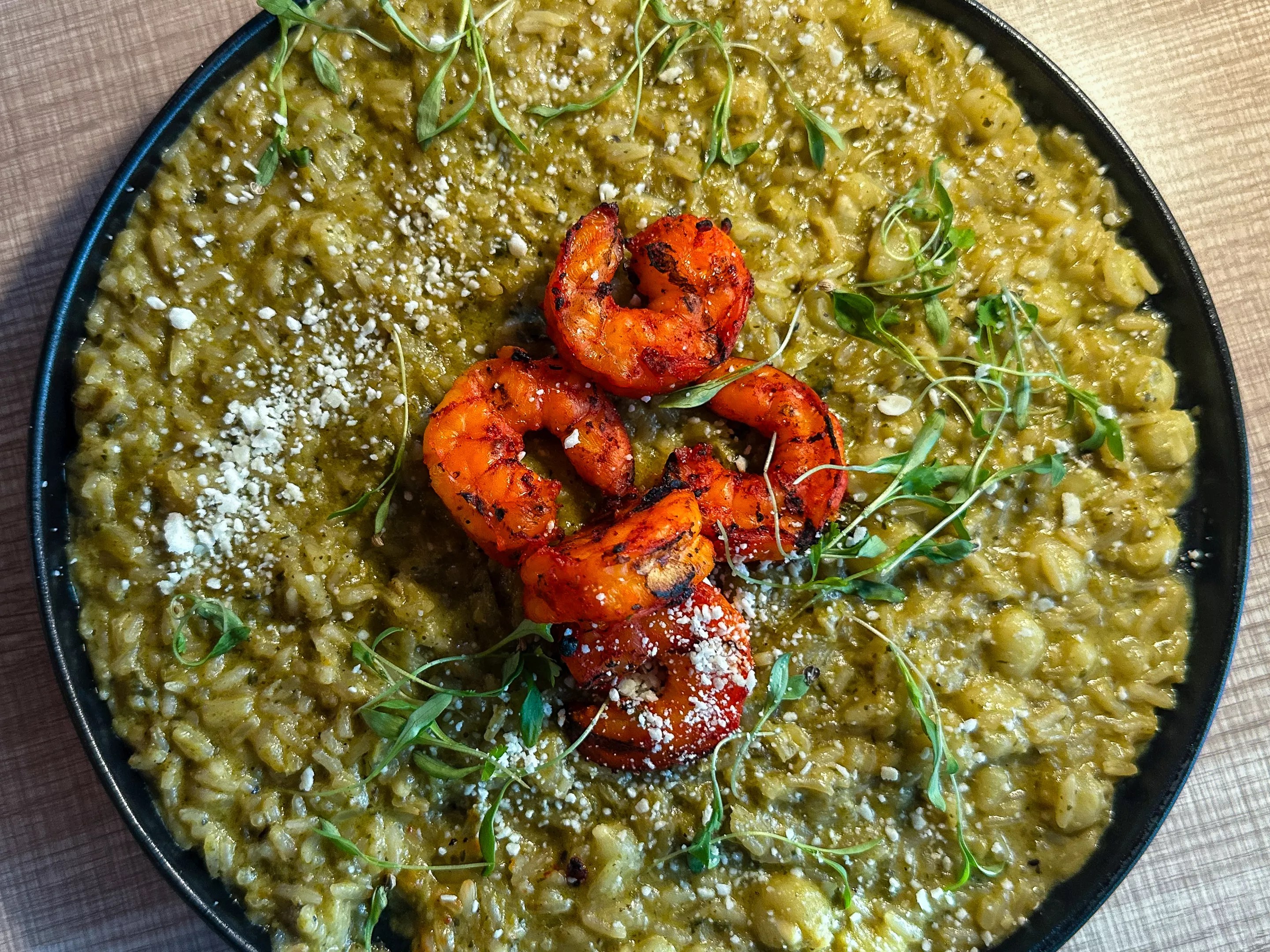 Arroz poblano arrived in a huge plate filled with poblano rice and heirloom corn, topped with grilled al pastor shrimp and garnished with micro greens and a blend of Mexican cheeses. The rice was creamy and almost resembled a risotto, and the large, tender pieces of corn were very similar in size and texture to hominy.