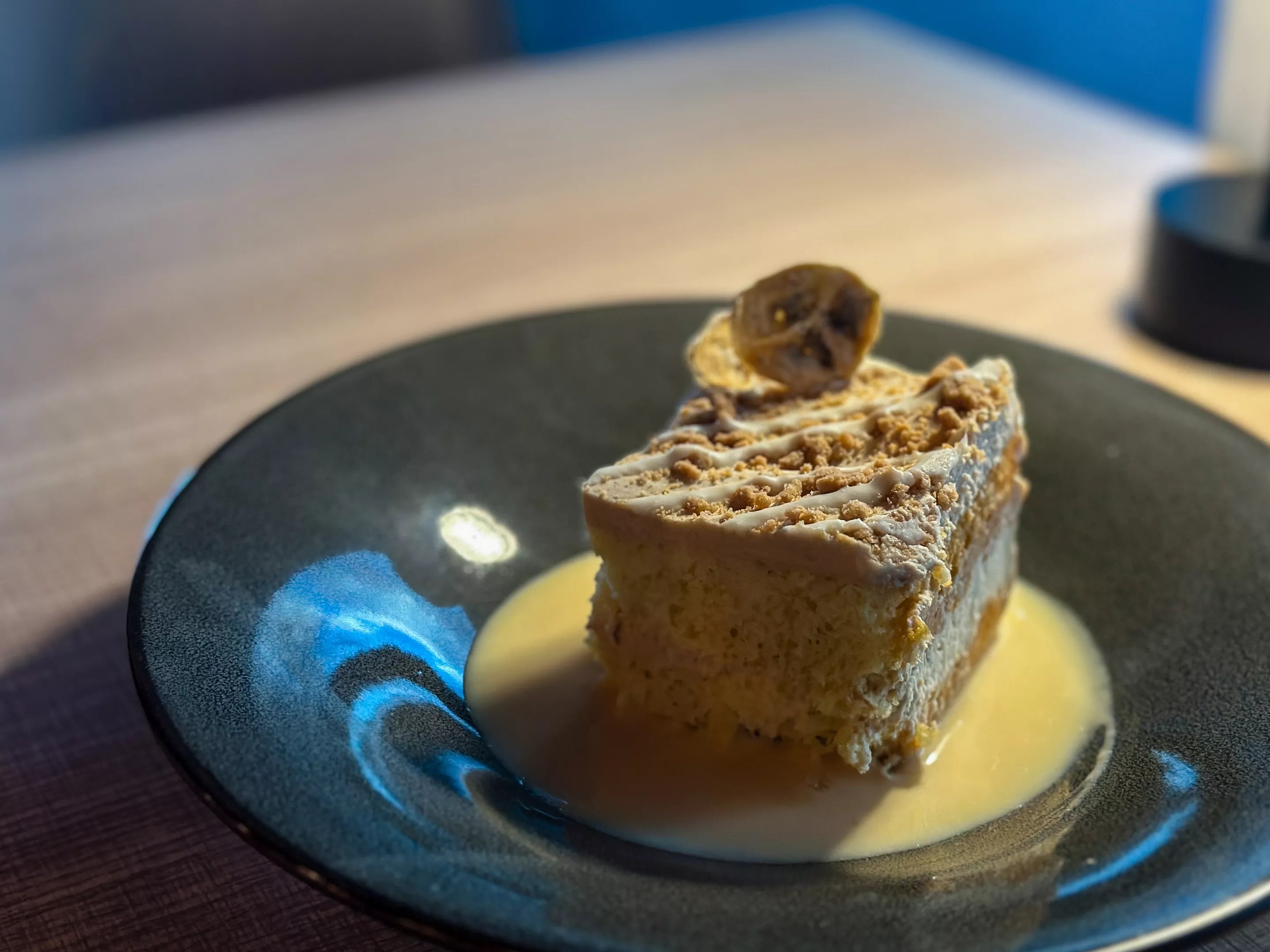 We finished the meal with a dessert of tres leches con leche de maracuyÁ , a delicious and ample slice of cinnamon tres leches cake topped with passion fruit cream and whipped cream, then garnished with a banana chip. This was good, not overly sweet and a fitting end to an above-average meal.