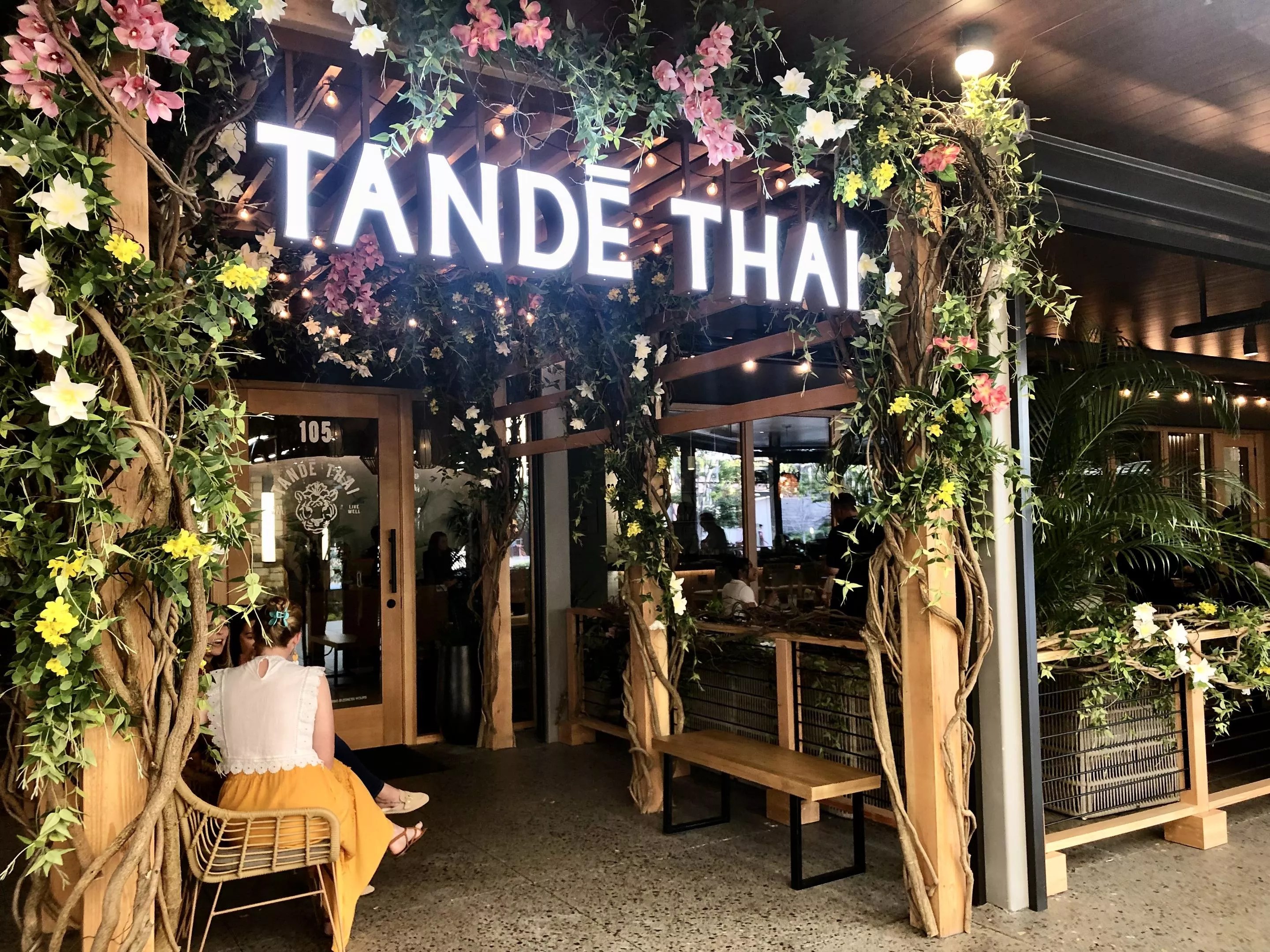 Tande Thai is tucked away in The Grotto at Grandscape in The Colony. It’s not too hard to find thanks to its entryway, which is decked out in gorgeous flowers perched on curving branches, greenery and vines. We’ve been anxious to try this spot since receiving a press release about it earlier this year and learning the chef’s story.