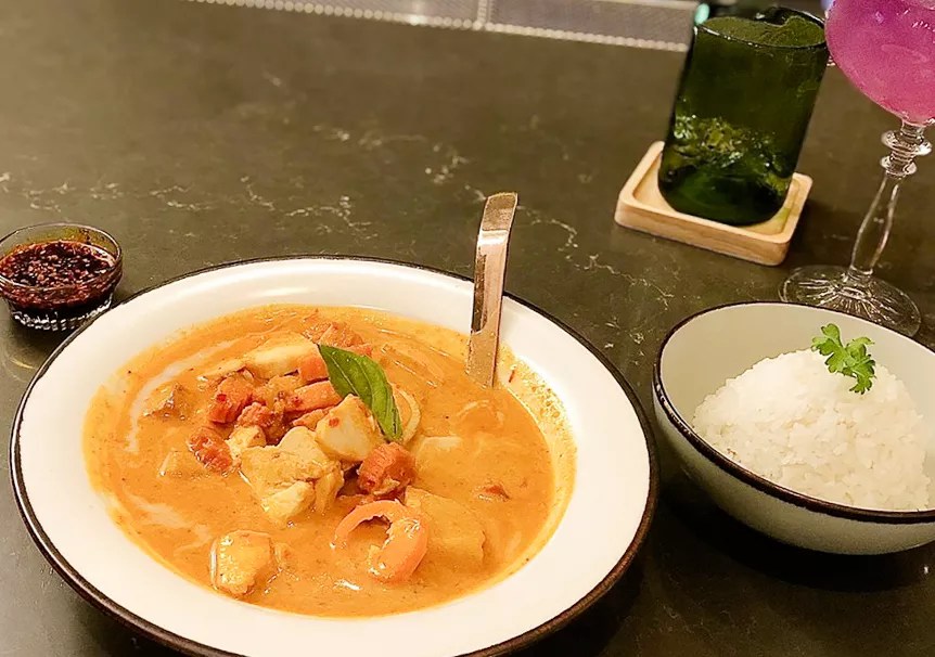 Yellow curry with chicken and jasmine rice; in the background, a side of chili oil and the Blue Elixir, made from butterfly pea flower tea and lemonade.
