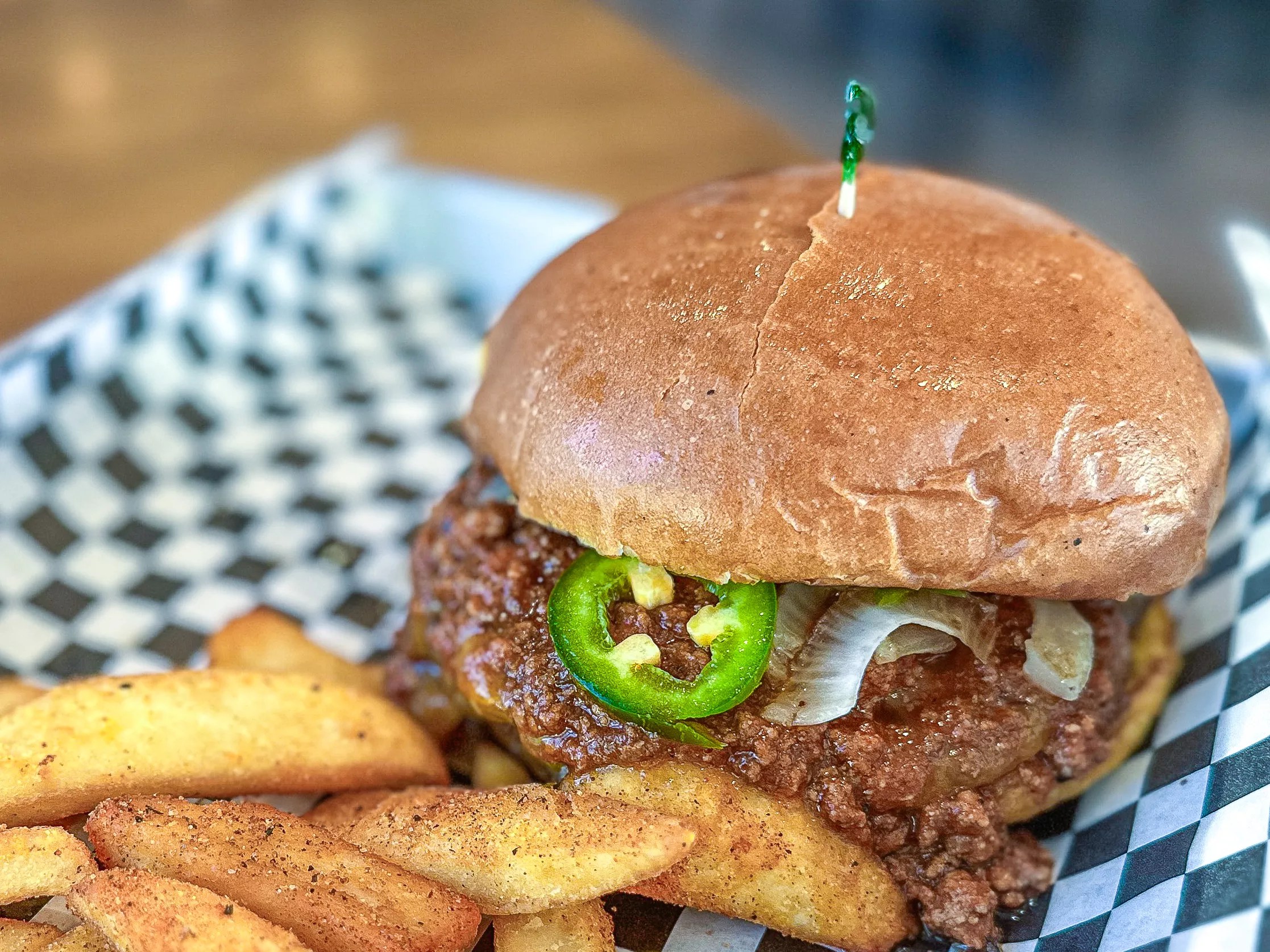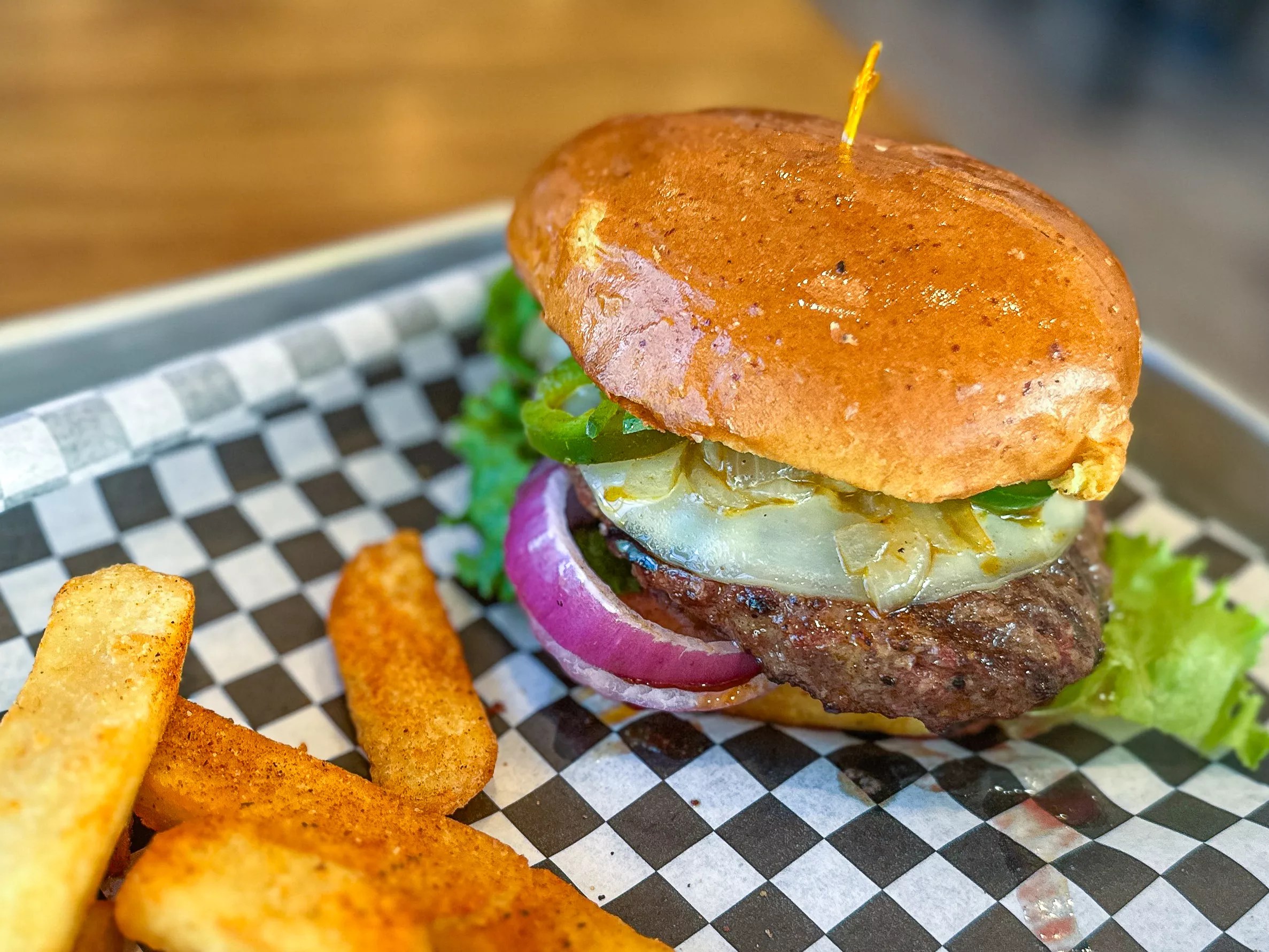 The chili cheeseburger is topped with homemade chili, shredded cheddar cheese, fresh jalapeños and tobasco onions.