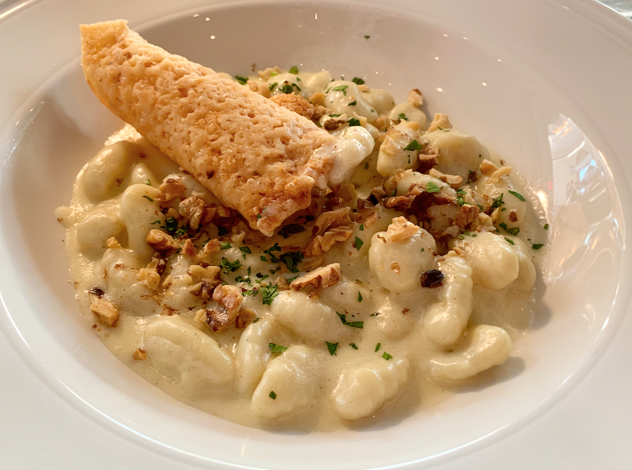 Gorgonzola gnocchi is served with toasted walnuts.