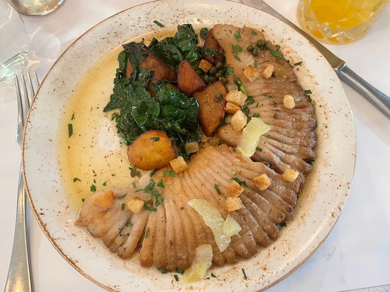 We started with one of the few dishes under $30 (there is a separate lunch munch with a lower overall price point). The raie au beurre noisette (skate wing with brown butter) is a mild-flavored fish served with a lemon brown butter sauce, speckled with capers. Each tender bite was a delight.