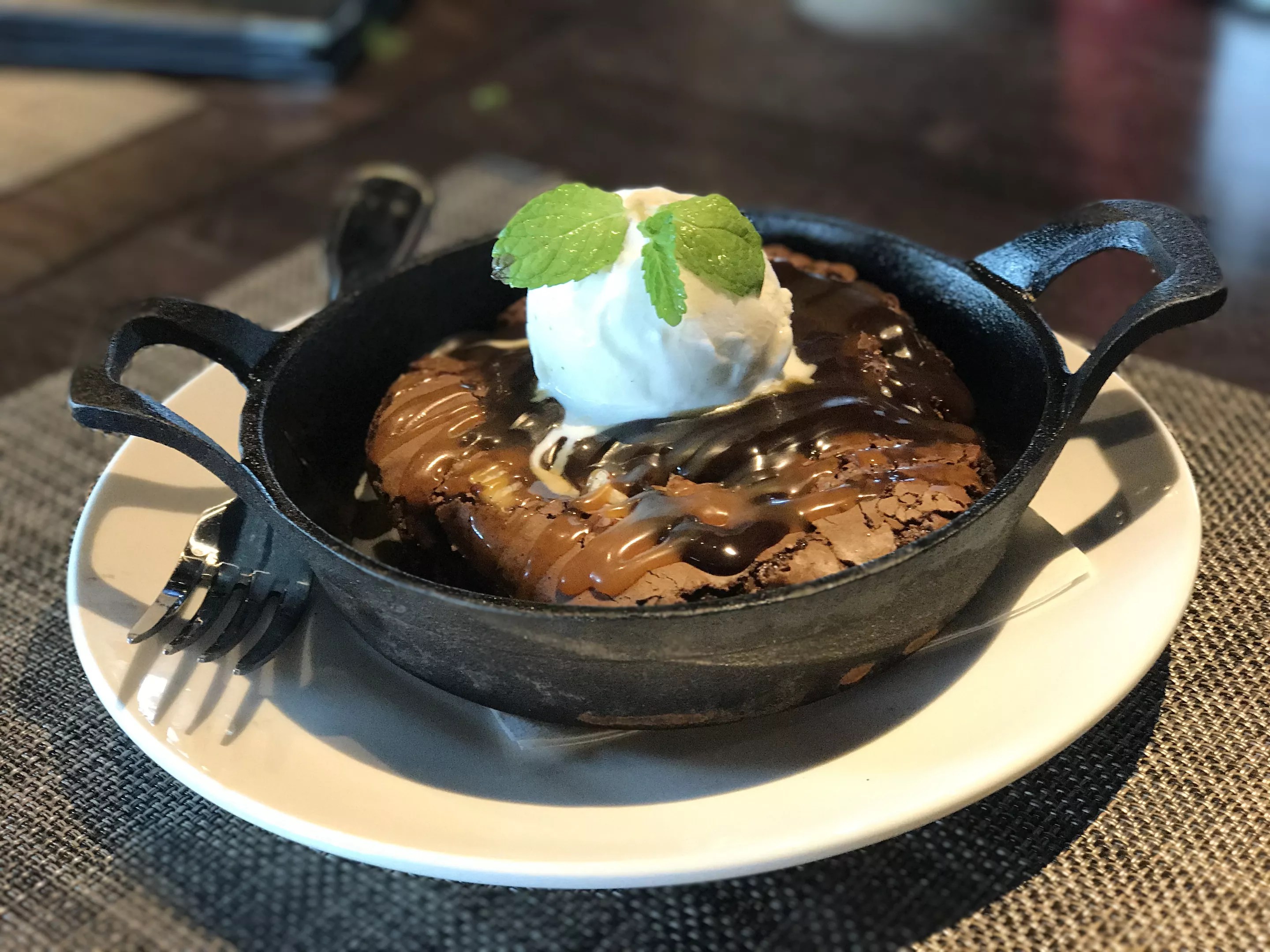 Square brownie in a round dish aside, the Thirsty Lion dessert hits our sweet spot.