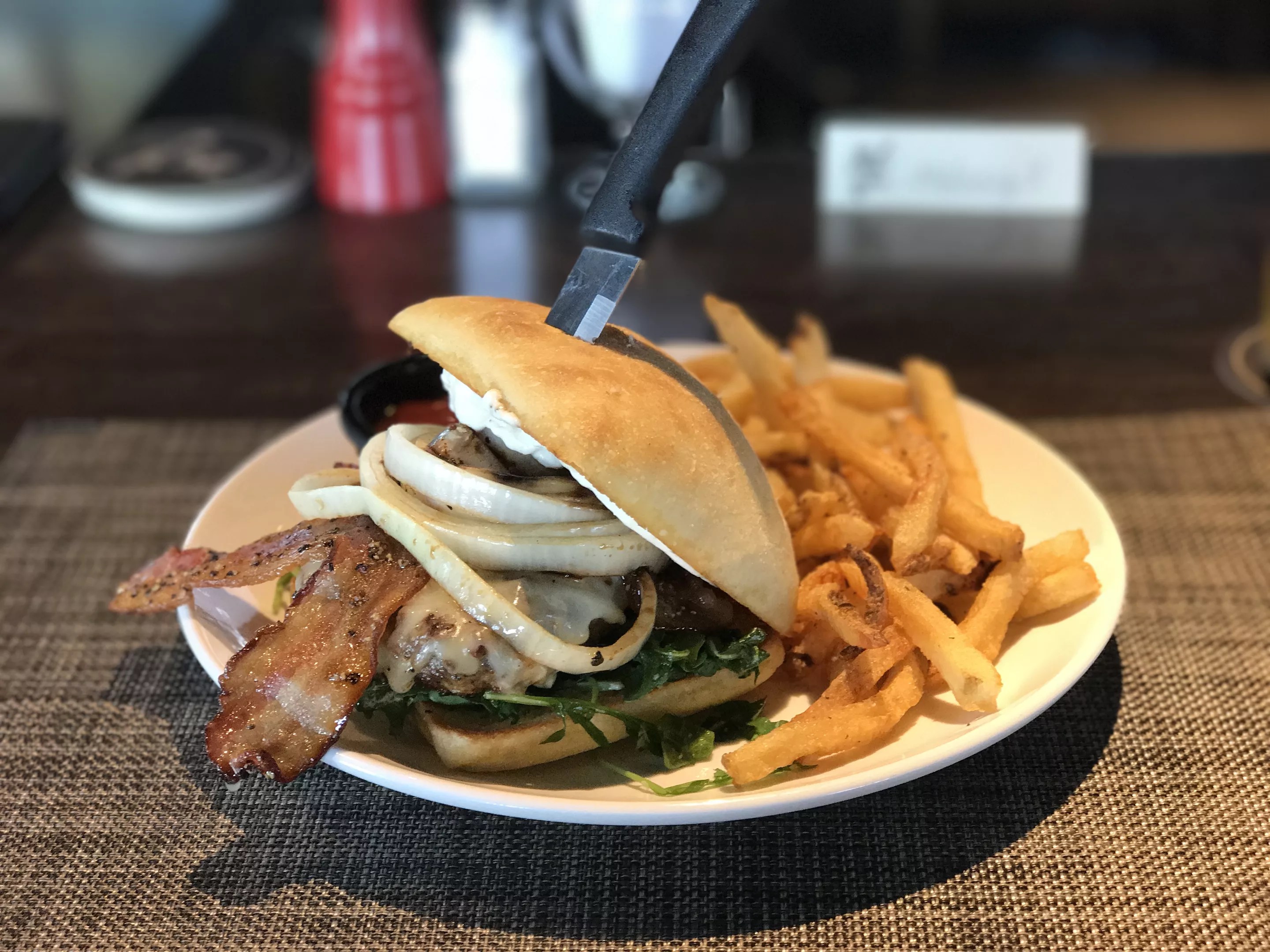 The burger comes impressively stacked on a ciabatta roll, knife protruding from the center, and a healthy portion of well-seasoned french fries. The patty was juicy, if cooked slightly beyond the medium we requested, and the cheeses and horseradish oozed through every bite. Our gripes were but two: First, the bacon was somewhat limp and didn’t add much saltiness to the sandwich. Second, the onions could’ve been grilled longer to soften them up, and so many were stacked on our sandwich that they overpowered the other flavors of the burger.