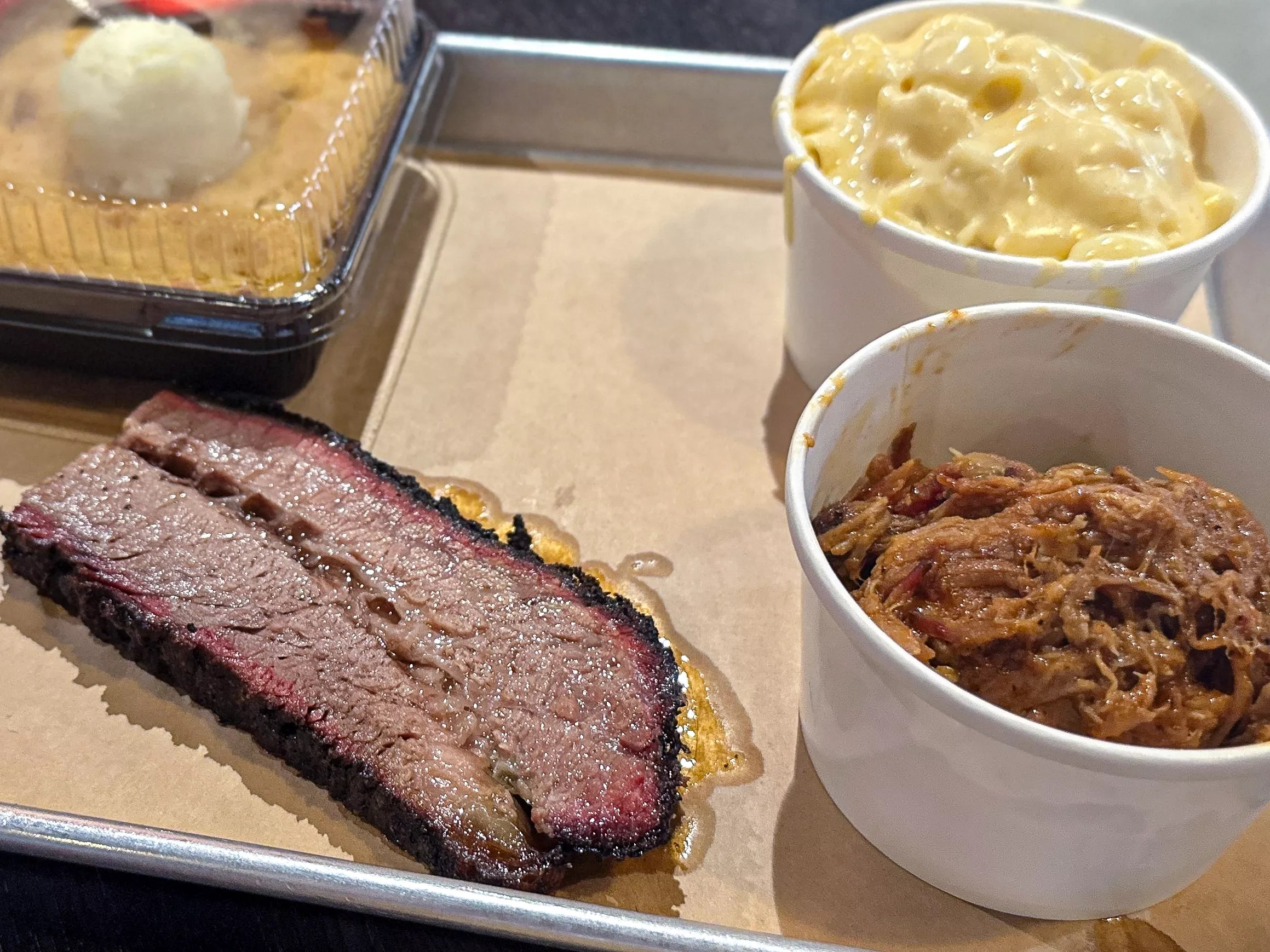 Two-meat plate with fatty brisket, pulled pork, mac and cheese and serrano cornbread.