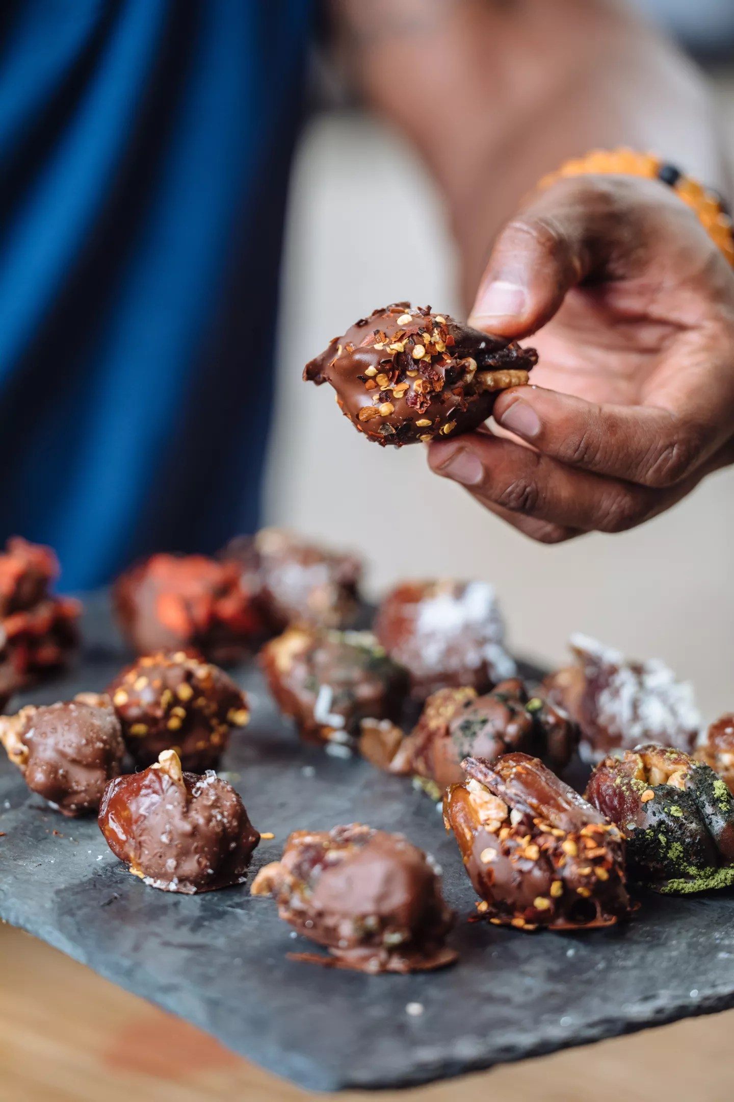 Curry makes dipped wrapped date snacks.