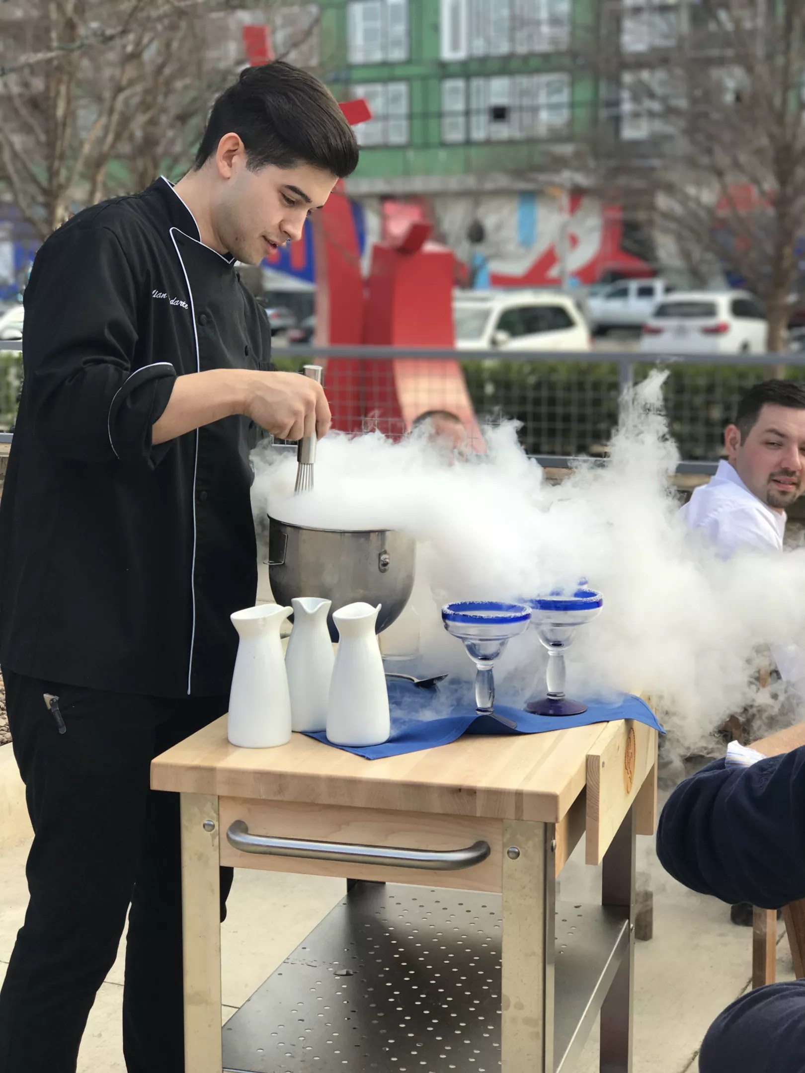 Longtime Dallas restaurant veteran Stephan Pyles was one of the first adopters of liquid nitrogen in an effort to “upgrade” his legendary margarita from his famed ’90s Star Canyon restaurant in his all-things-Texas restaurant, Stampede 66. He offers his already exciting Star Canyon Margarita (blanco tequila, prickly pear puree, Patrón Citronge, lime foam and candied jalapeños) and whips it with a generous pour of liquid nitrogen at arm’s distance from your table.