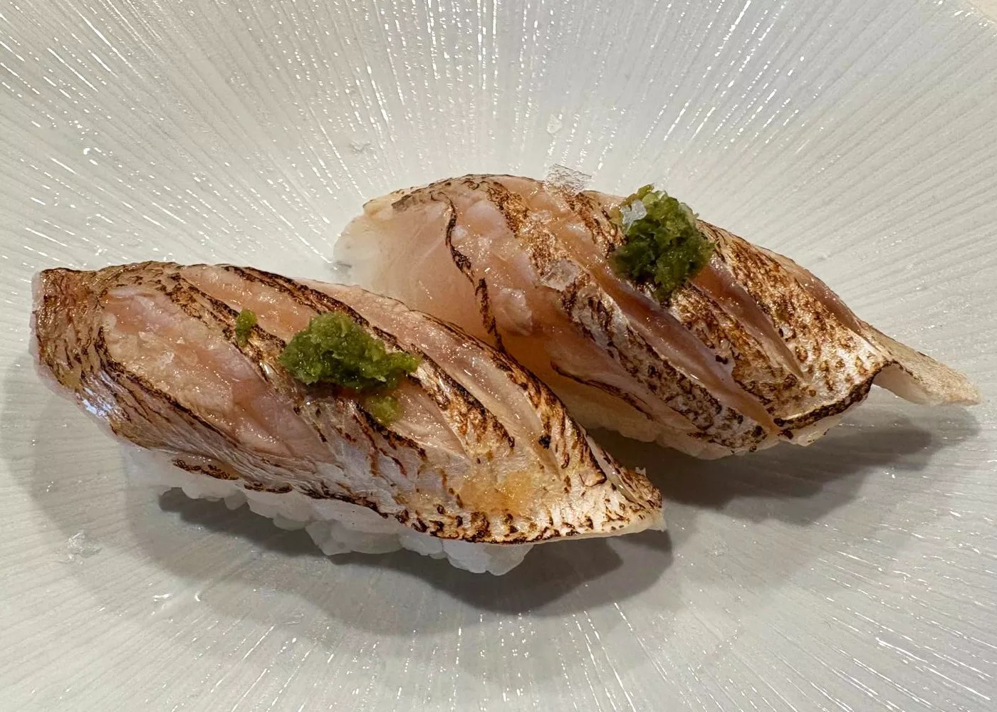 Sitting at the sushi counter is the key to getting a few free bites from the chefs. Ours was young seabream sushi.