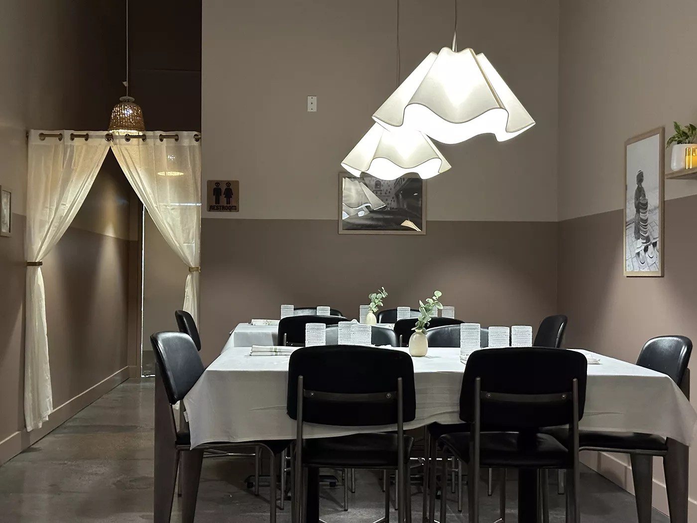 Warm lights shine through sheer curtains. Gone are the playful signs. In their place are neutral crisp tones: white counters, two-toned stone brown and cream walls and rippled scallop pendants that resemble flowers. Natural wood, mirrors, vases of dehydrated fruits and potted greenery surround a backbar shrine of tequilas.