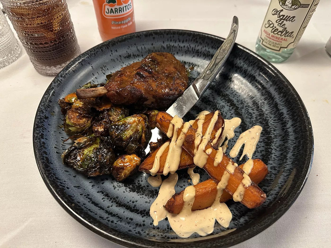 The Duroc pork chop is served bone-in with sweet potatoes and Brussels sprouts.