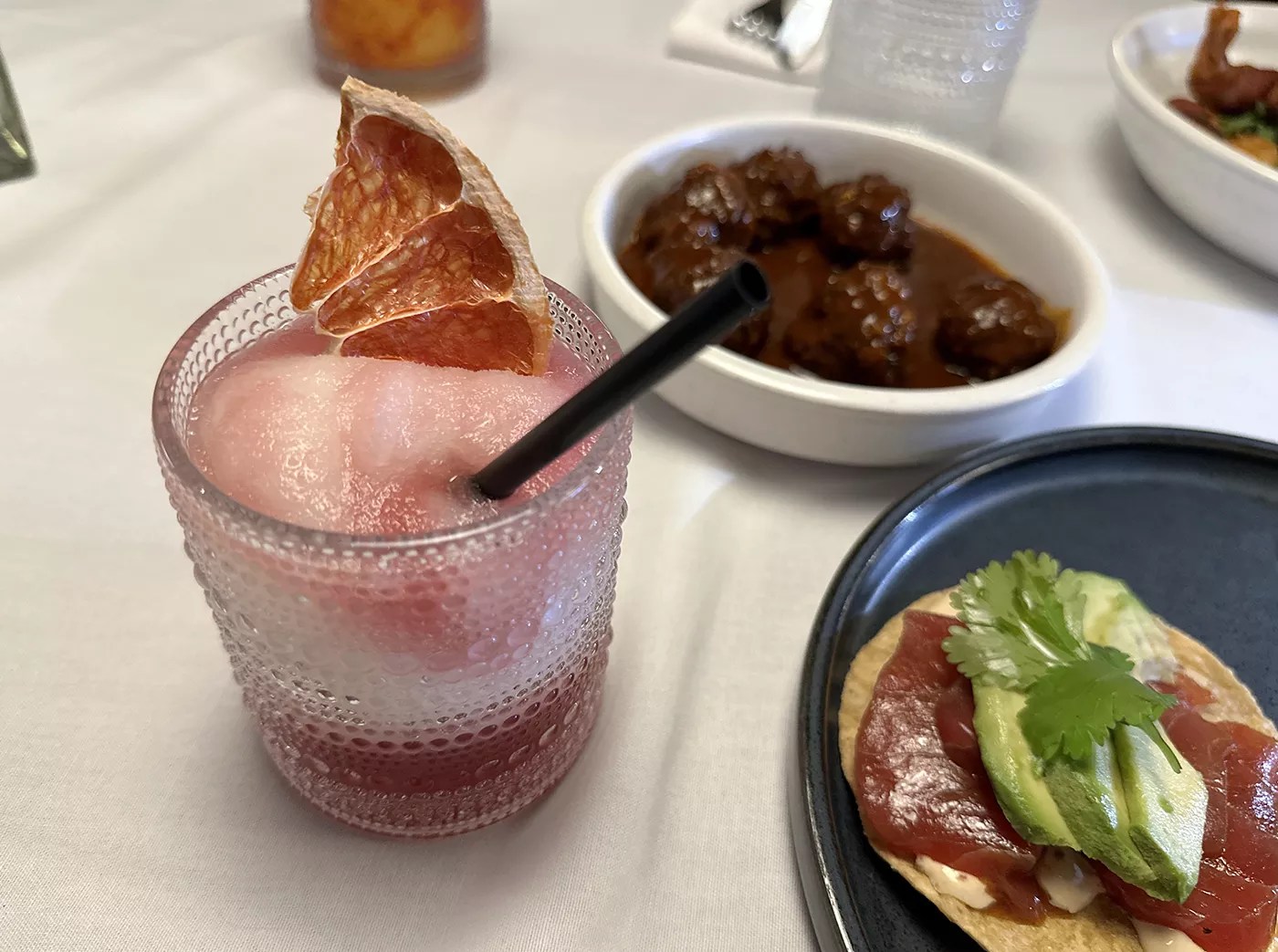 Casa Alma’s bar program is cocktail-heavy, specifically margaritas, with a selection of wines and beers as well. Beverages average $12 to $14, with the standout El Jefe margarita priced at $24. It features El Arenal, Jalisco’s Tequila Cascahuín Blanco Tahona. The spirit is crafted with a tahona, a traditional volcanic stone mill wheel. We opted for a fruity mangonada ($14), a mango margarita served with a tamarind candy straw, and the Uber ($14), a sangria swirl margarita.
