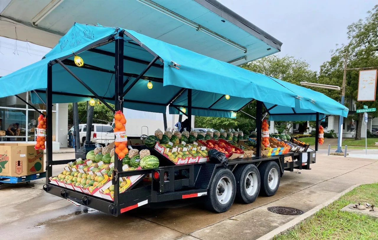 Micho’s Oak Cliff Central Market is a simple trailer topped with a turquoise canopy and stuffed with boxes of fruit.