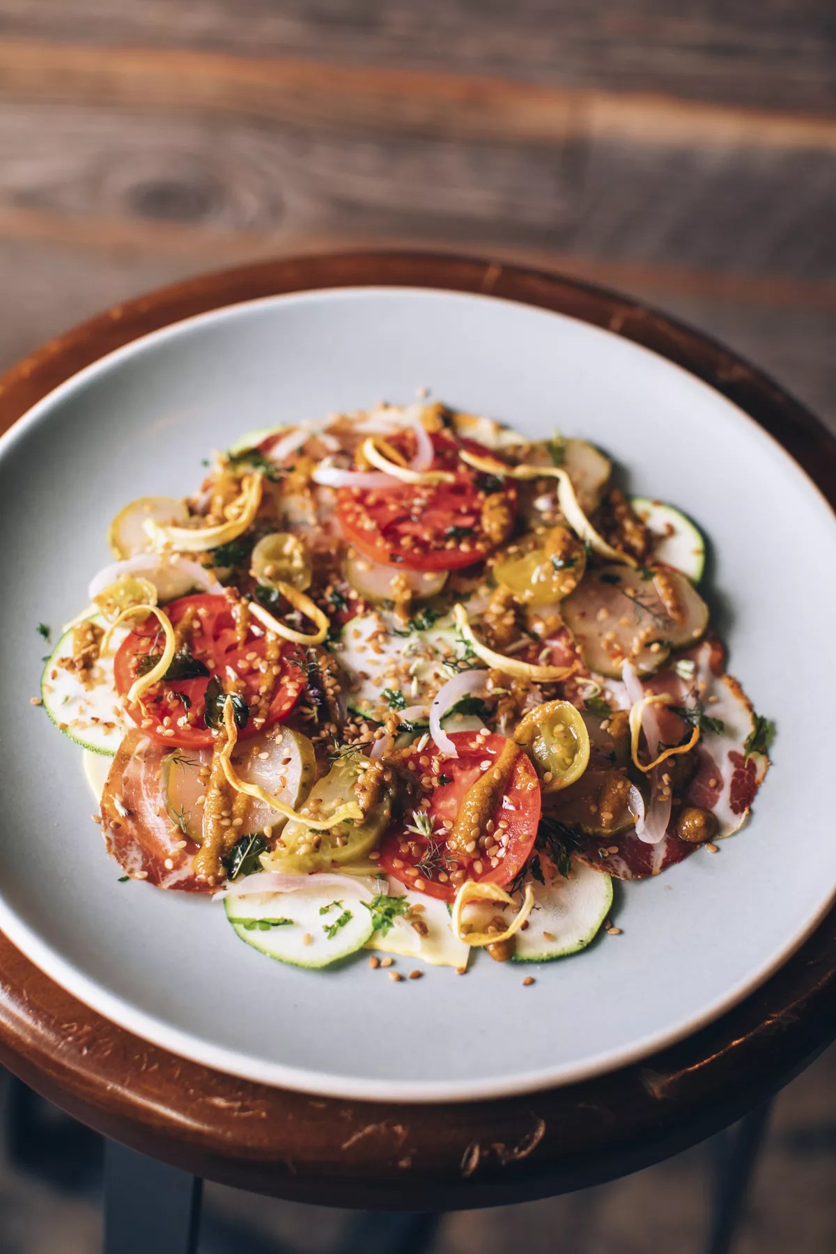 There’s now, momentarily, a salad that ranks among the simplest and best in the city. It involves thinly sliced summer squash and coppa, arranged across the plate in a wide, thin circle, dotted with cherry tomatoes, herb dressing and benne seeds (an heirloom variety of sesame seed that has been grown in the South for two centuries).