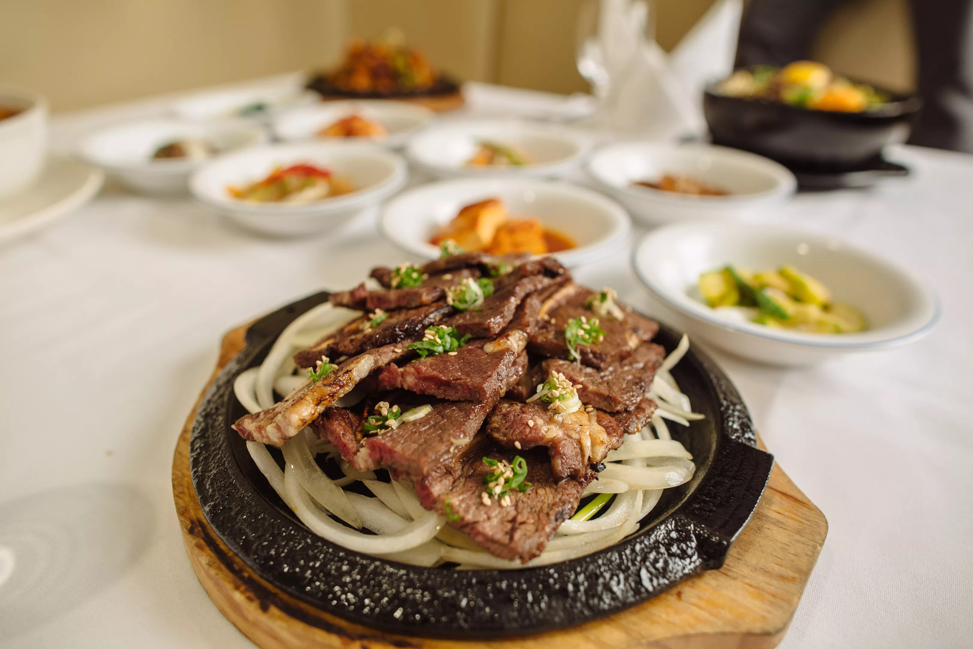 The buffet, frankly a bargain at $22.95 at dinner ($16.95 at lunch), does not disappoint. It takes place upstairs in its own dining room. Some of the features here will be familiar to anyone who’s been to a Korean barbecue restaurant: the do-it-yourself grilling on each table, the thrill of occasional flames, the staff happy to help by tending the grill and flipping meats. Scissors, rather than knives, are provided for trimming meat down to chopstick-sized pieces.