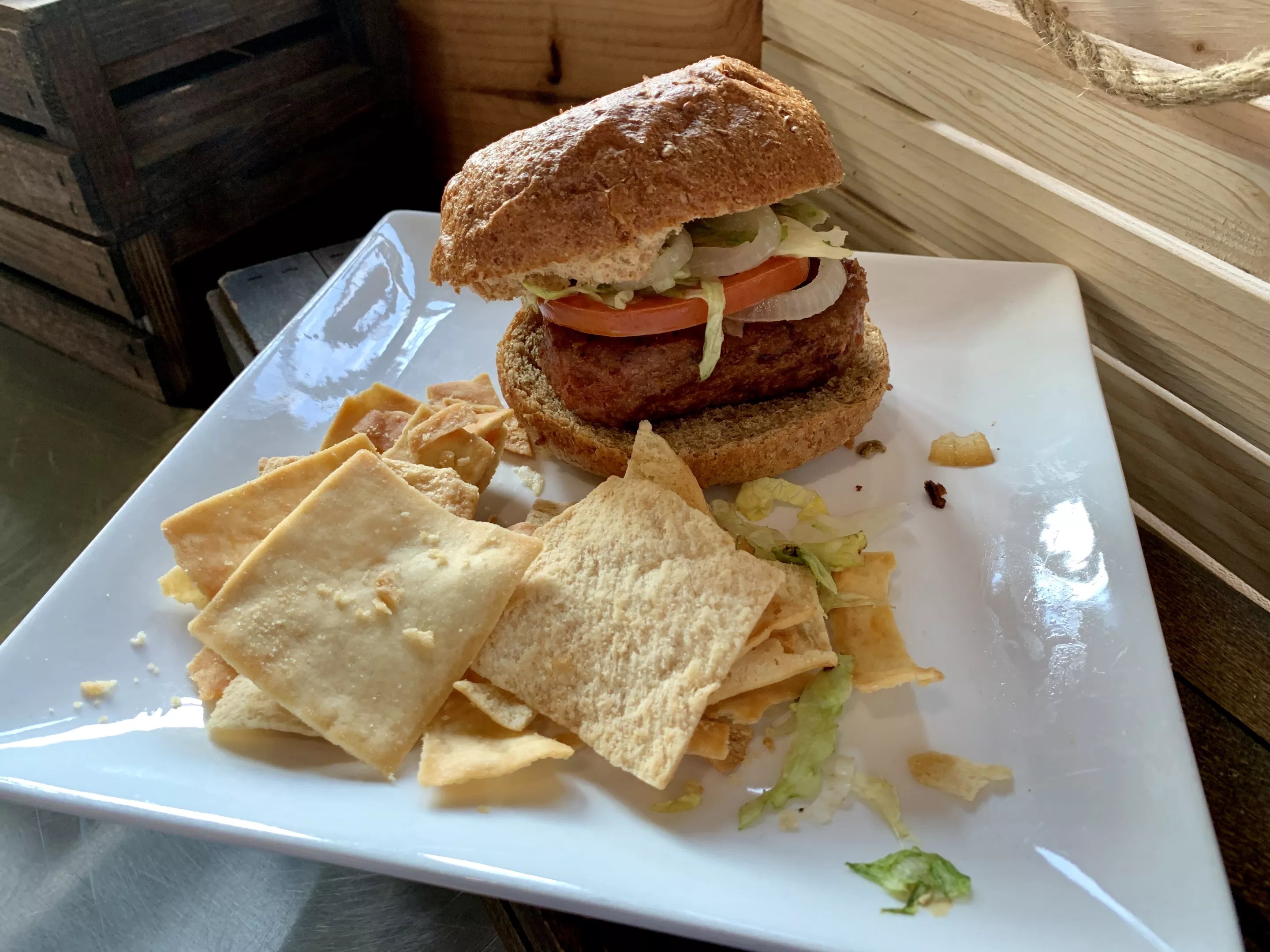 The vegan grande nachos ($13.50) are loaded with vegan cheese, vegan chili, lettuce, tomato, olives and pickled jalapeños. They are a worthy replica of “regular” nachos. Even our meat-loving companion was impressed with the flavor.