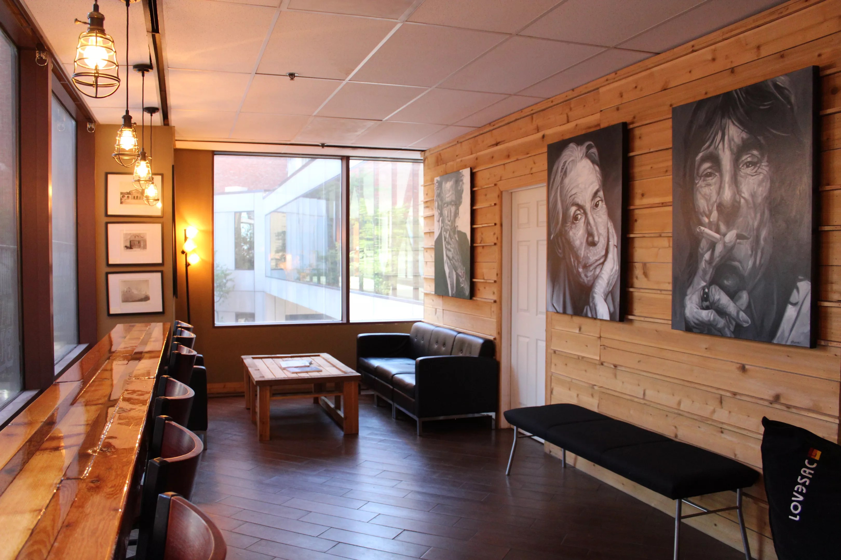 But they do have a nearly hard-to-find location in one of the sky bridges of downtown, on the second level right above Elm Street and Pacific Avenue. There are floor-to-ceiling windows in the small seating area, with some impressive work, including a portrait of Mick Jagger, by local artist Steve Hunter.