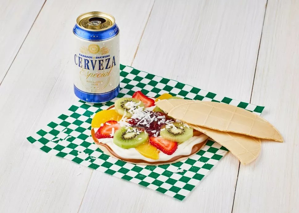 Vendor: Tony and Terry BednarA thin waffle is covered with caramel dulce de leche, cream, slices of strawberry, kiwi, peach and shredded coconut, then topped with raspberry jam. Trail-Ade. State Fair of Texas
