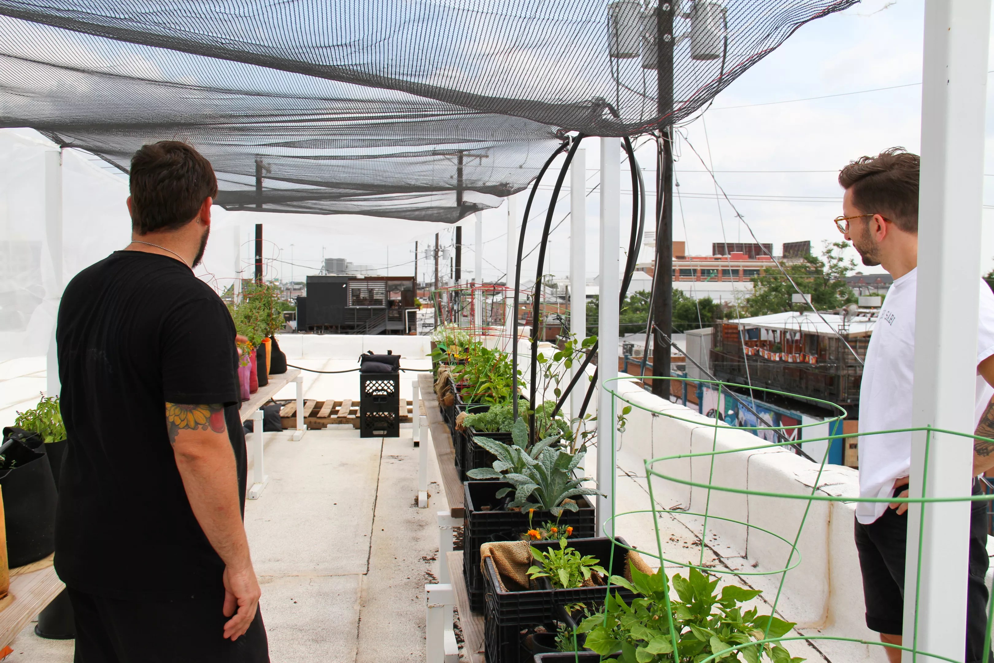 Joel Orsini (left) and Yoni Lang look over the plants that have resided on the rooftop of Izkina for less than a year. Future plans mean more plants on this space that