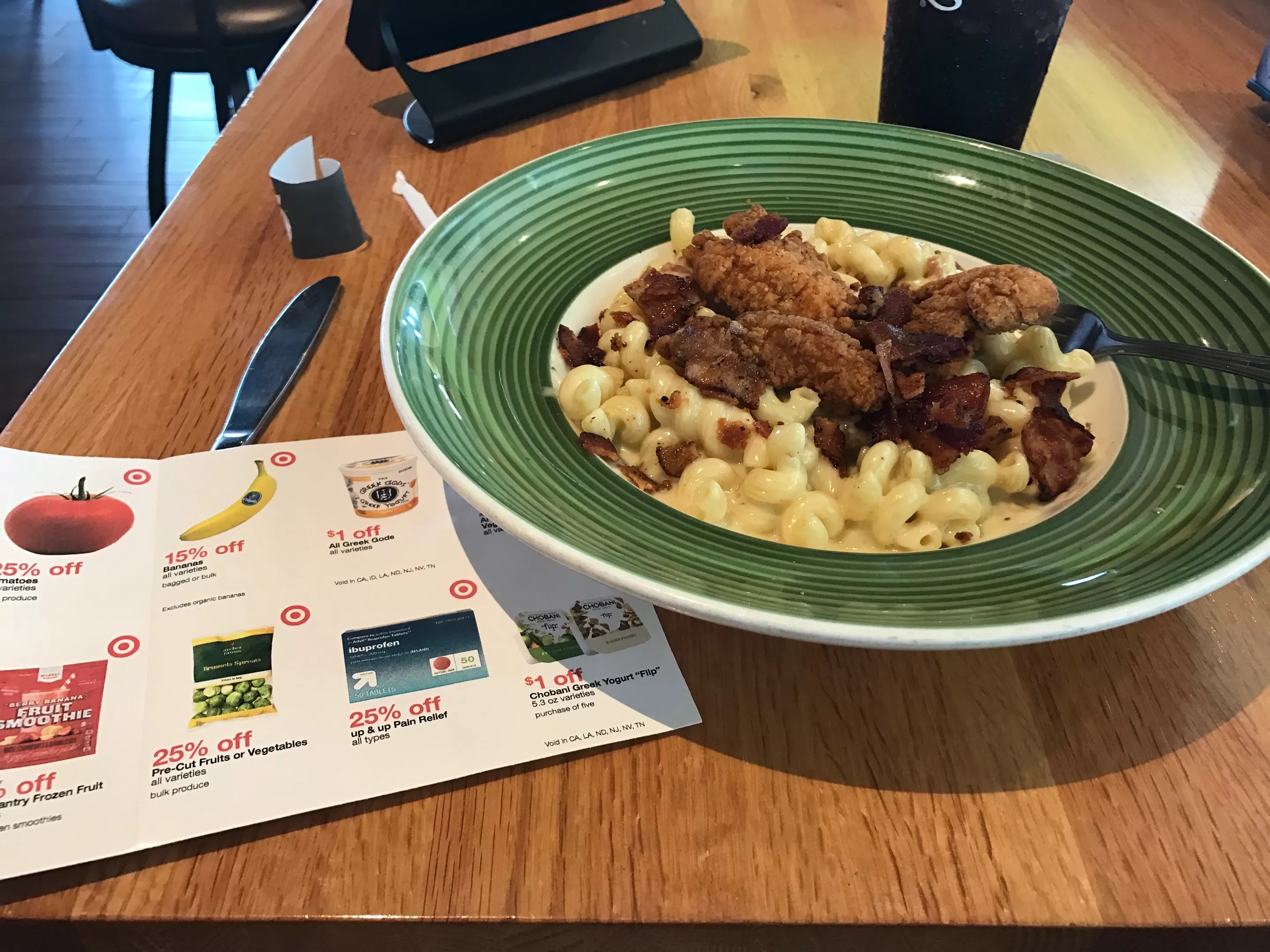 The day after my discount Applebee’s visit, I tried my luck again at the location at Belt Line and Plano roads. I ordered a Dr Pepper and mac and cheese with honey pepper chicken again, but hold the honey pepper chicken. The taste did not improve with the omission. I overheard a couple order Jell-O shots. It’s 1 p.m.