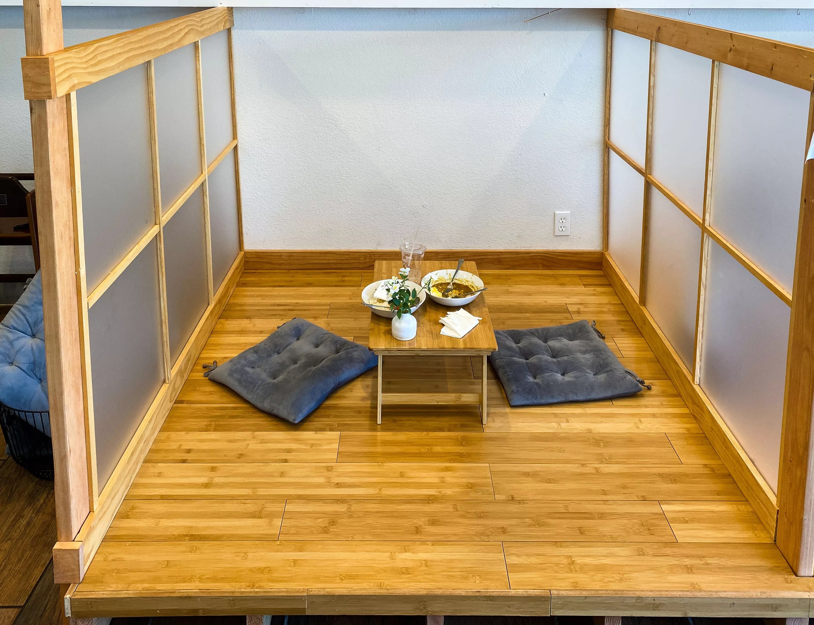 Visitors can dine in one of their chairless booths if they’re willing to remove their shoes and sit on a pillow during the meal. These were popular choices and never remained empty for very long. It was a moot point for us, however, in that at this stage in life eating whilst sitting on a pillow on the floor has lost some of its bohemian appeal. Plus, no one wants to hear the creaking of joints. We opted for a table.