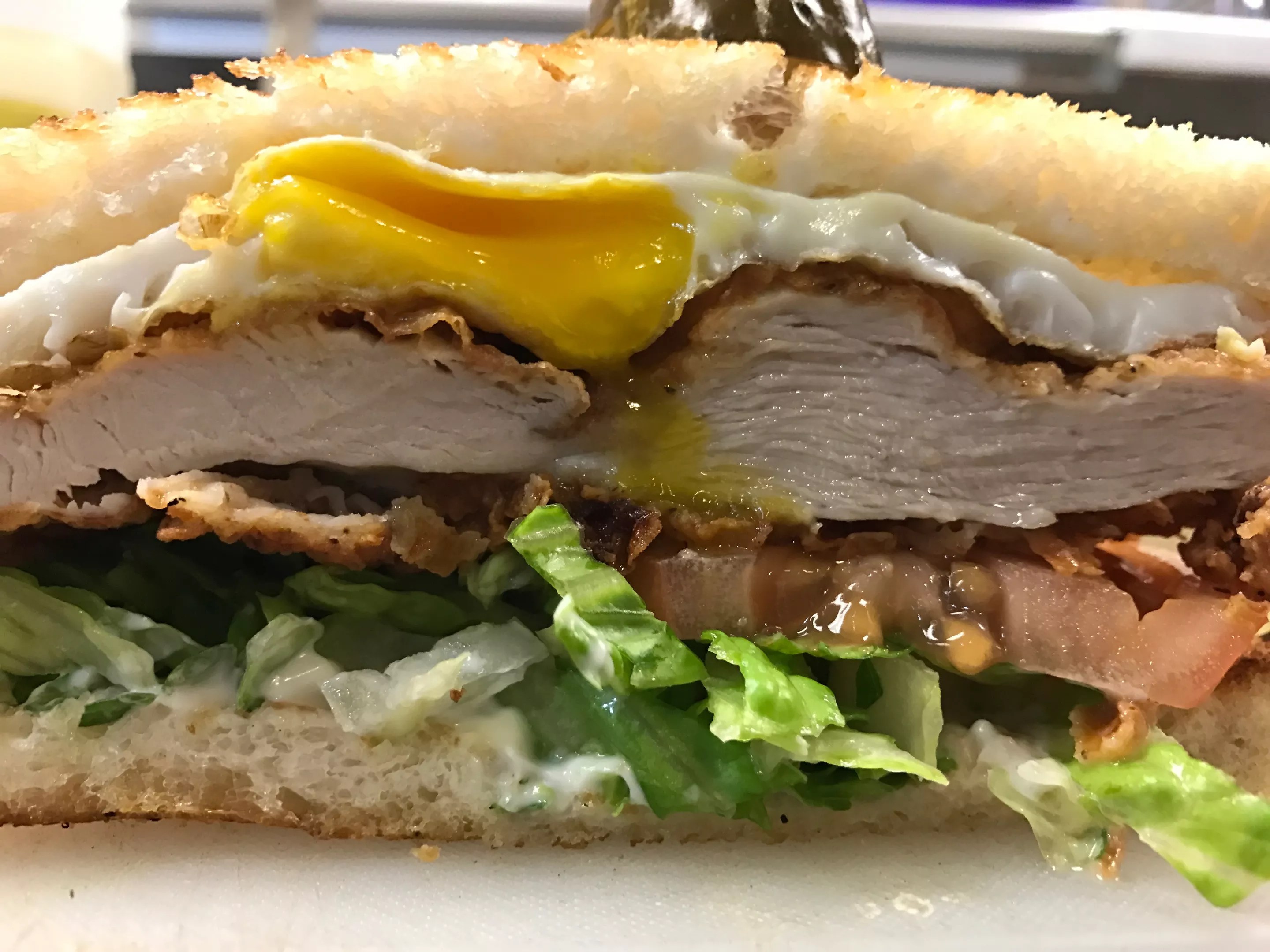 Once the chicken is deep-fried to a fashionable crisp, it sits on heavily buttered, grilled bread – the sourdough is charred on both sides – along with fresh shredded lettuce, tomato slices and two fried eggs. It’s a masterful, steam-hot and juicy sandwich that tastes like nothing more than the sum of its parts.