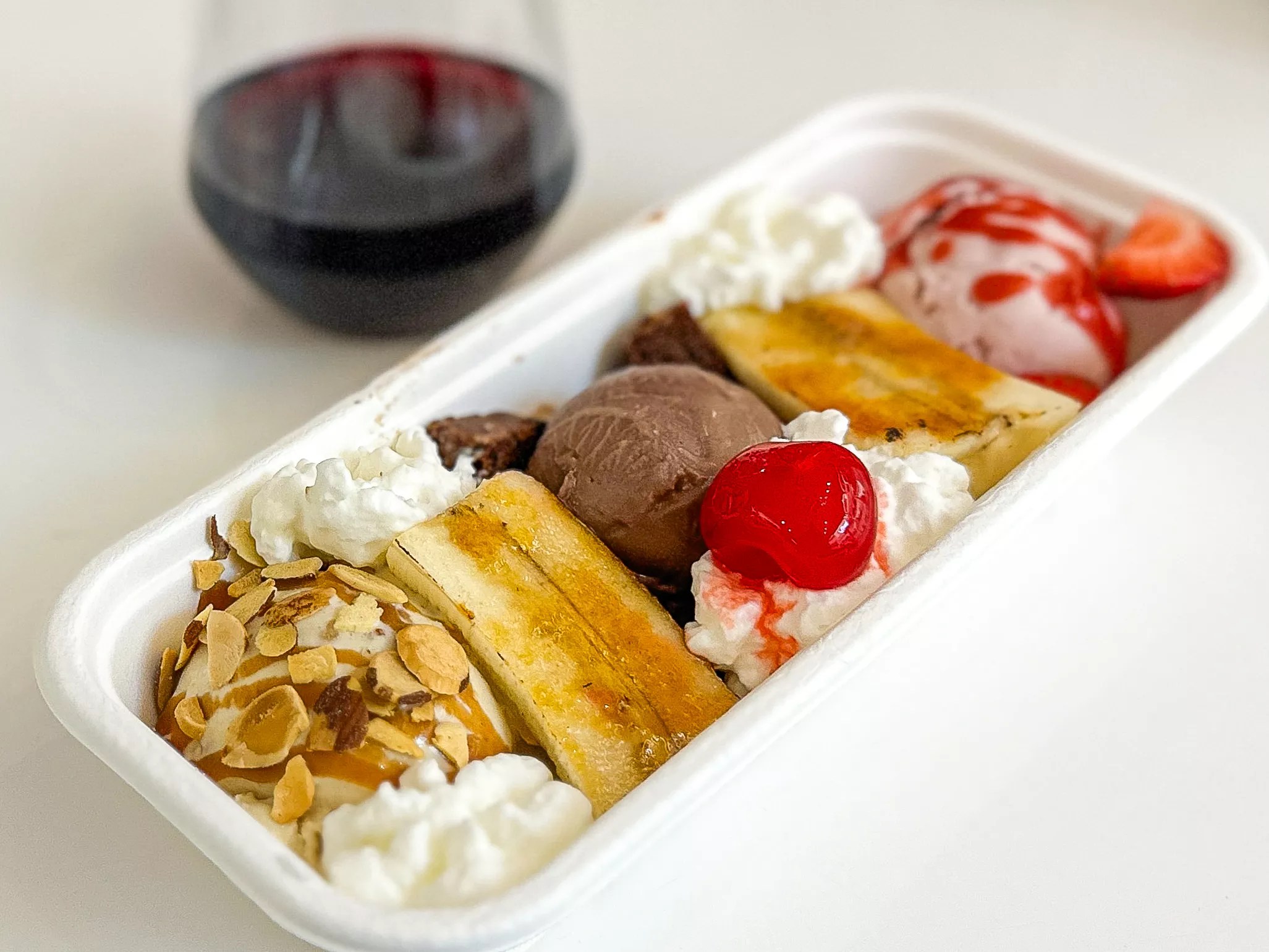 The epic banana split really was a feast of taste and texture: dark chocolate, strawberry and cookie butter ice cream surrounded by caramelized bananas, almonds, brownie bites, strawberries and whipped cream with a cherry on top, all served in a container about 8 inches long. Just enough.