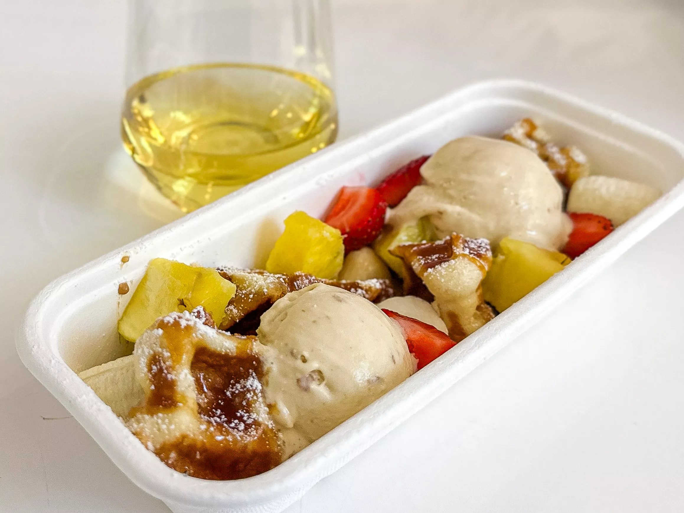 The sweet waffles were a mélange of pieces of Belgian liège waffles, fresh pineapples, bananas and strawberries, with salted caramel, cookie butter crémeux and Biscoff waffle ice cream. It was all very decadent and delightful, but the liège waffles were perhaps a bit wanting in the pearl sugar area. The Biscoff ice cream, on the other hand, perfectly captured the flavor of that cookie so popular on cross-continental airplane trips as of late.